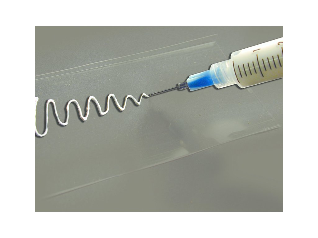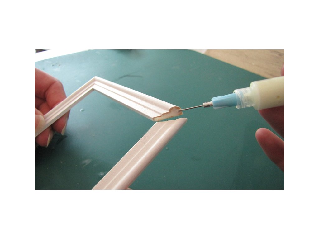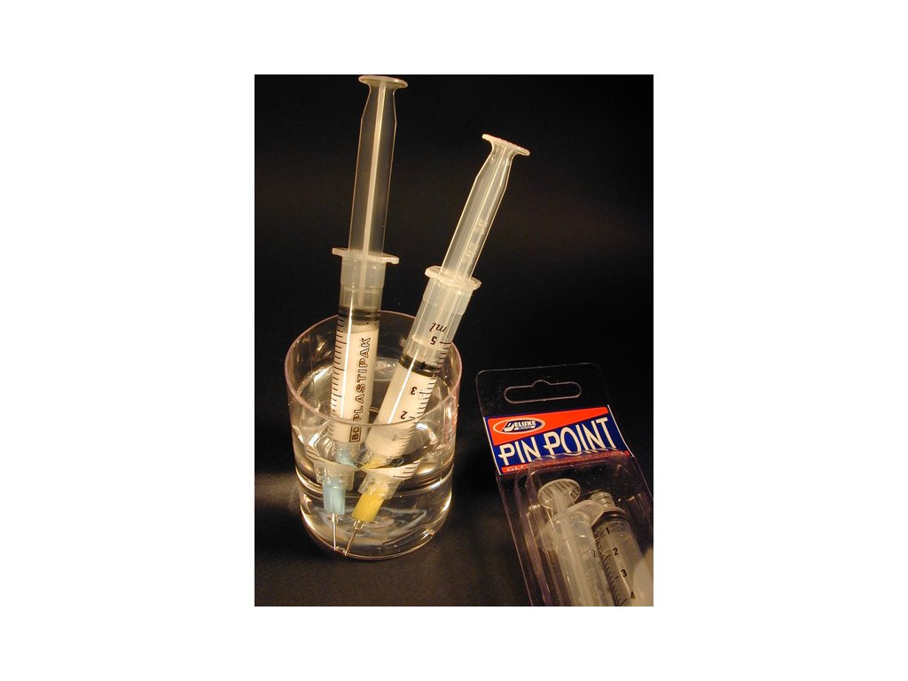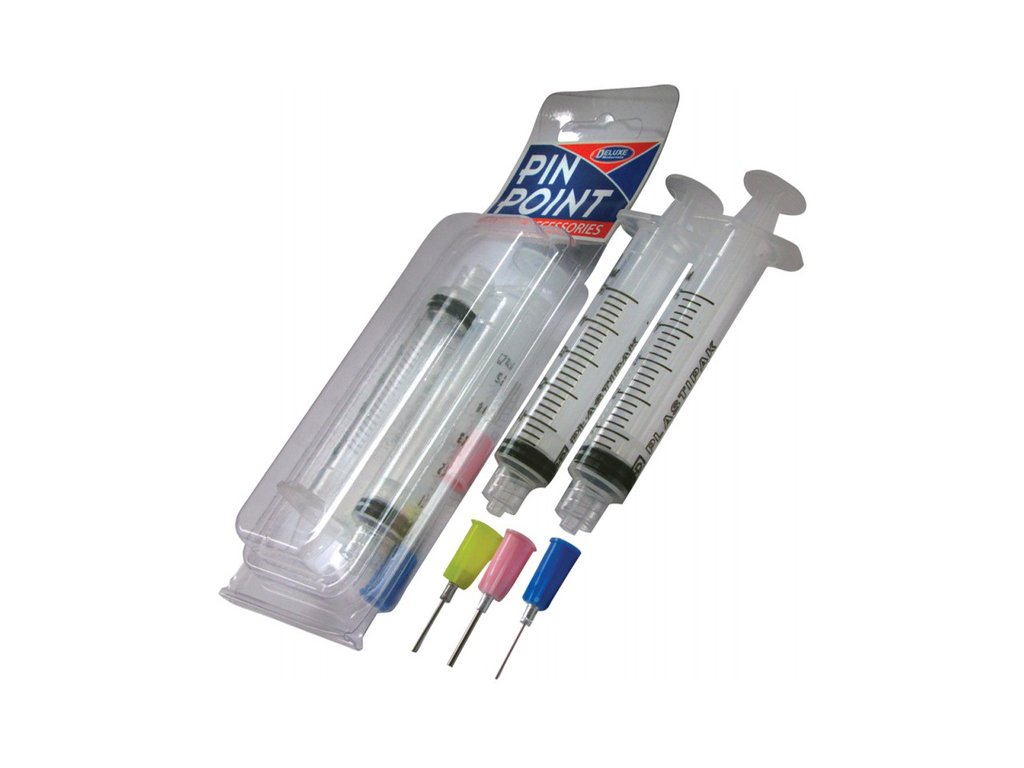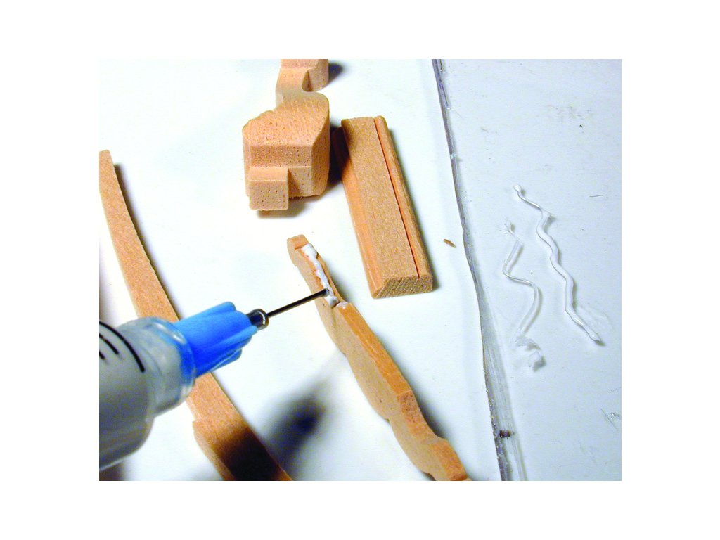 Sada dvou injekčních stříkaček se 3 tlustými nerezovými jehlami slouží pro přesnou aplikaci vodou ředitelných lepidel. Po skončení práce je potřeba vypláchnout stříkačky a jehly vodou.