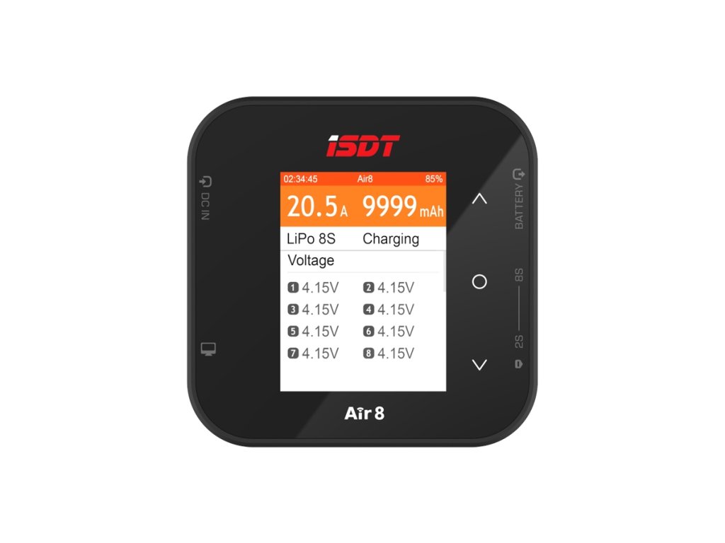 Miniaturní nabíječ ISDT Air 8 500W je výkonný inteligentní nabíječ s napájením z autobaterie nebo stabilizovaného síťového zdroje a velmi jednoduchou a přehlednou obsluhou. Air 8 umožňuje nabíjet a vybíjet běžné typy článků (NiCd, NiMH, LiPo, LiHV, ULiHV, Li-ion, LiFe, Pb), navíc je vybaven vestavěným osmikanálovým balancerem, který zajišťují bezpečné nabíjení lithiových akumulátorů. Nabíječ je vybaven barevným LCD displejem a dotykovými programovacími tlačítky, které vám poskytnou možnost komfortního a velice přehledného nastavování parametrů, řízení a sledování průběhu nabíjení/vybíjení.
