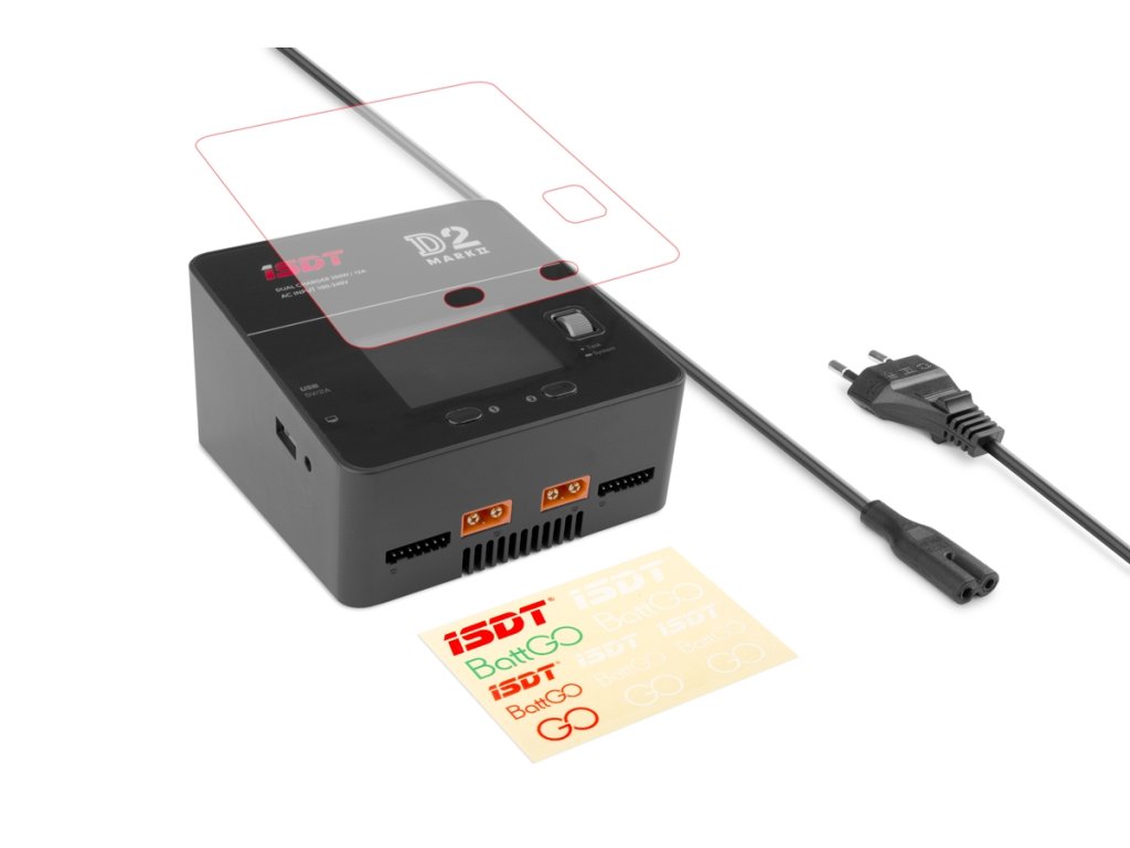 Sada nabíječe obsahuje: nabíječ ISDT D2 Mark II, síťový kabel, chránič displeje, návod.