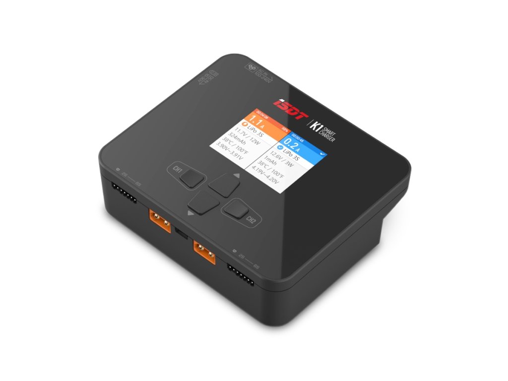 Malý dvoukanálový nabíječ ISDT K1 2x250W je inteligentní nabíječ s vysokým výkonem s napájením ze sítě i autobaterie a velmi jednoduchou a přehlednou obsluhou. K1 umožňuje nabíjet běžné typy článků (NiCd, NiMH, LiPo, LiHV, ULiHV, Li-ion, LiFe, Pb), navíc je vybaven vestavěnými šestikanálovými balancery, které zajišťují bezpečné nabíjení lithiových akumulátorů. Nabíječ je vybaven barevným LCD displejem a programovacími tlačítky, které vám poskytnou možnost komfortního a velice přehledného nastavování parametrů, řízení a sledování průběhu nabíjení.