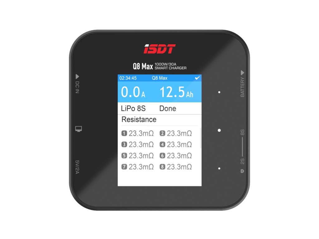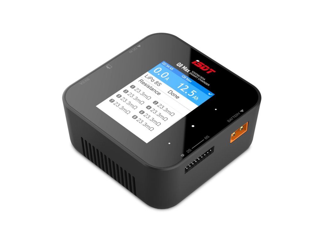 Miniaturní nabíječ ISDT Q8 Max 1000W je vysokovýkonný inteligentní nabíječ s napájením z autobaterie nebo stabilizovaného síťového zdroje a velmi jednoduchou a přehlednou obsluhou. Q8 Maxumožňuje nabíjet a vybíjet běžné typy článků (NiCd, NiMH, LiPo, LiHV, Li-ion, LiFe, Pb), navíc je vybaven vestavěným osmikanálovým balancerem, který zajišťují bezpečné nabíjení lithiových akumulátorů. Nabíječ je vybaven barevným LCD displejem a dotykovými programovacími tlačítky, které vám poskytnou možnost komfortního a velice přehledného nastavování parametrů, řízení a sledování průběhu nabíjení/vybíjení.