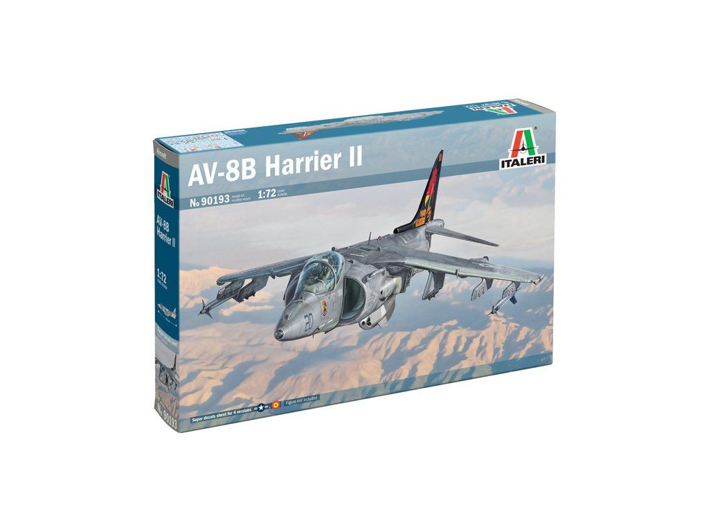 Italeri plastikový model stíhačky AV-8B Harrier II v měřítku 1:72 ke slepení. Délka 19,0 cm, stavební obtížnost 2.