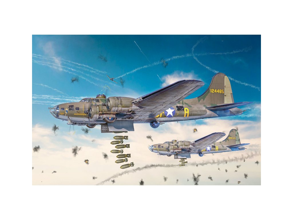 Boeing B-17 „Flying Fortress“ je čtyřmotorový těžký bombardér, který byl během druhé světové války hojně využíván americkými vzdušnými silami. Byl vyráběn ve velkých počtech a široce využíván, zejména 8. leteckou armádou, pro denní strategické bombardovací mise nad evropskou frontou, často s podporou doprovodných stíhaček s dlouhým doletem. Varianta „F“ představovala významný pokrok oproti dřívějším modelům. Boeing B-17F se vyznačoval větším operačním dosahem, schopností nést značnou útočnou zátěž a vylepšenou obrannou výzbrojí sestávající z deseti kulometů ráže .50. Jednou z nejvíce oceňovaných vlastností mezi leteckými posádkami byla pozoruhodná schopnost B-17 vrátit se na základnu i přes těžké strukturální poškození způsobené nepřátelskou palbou.