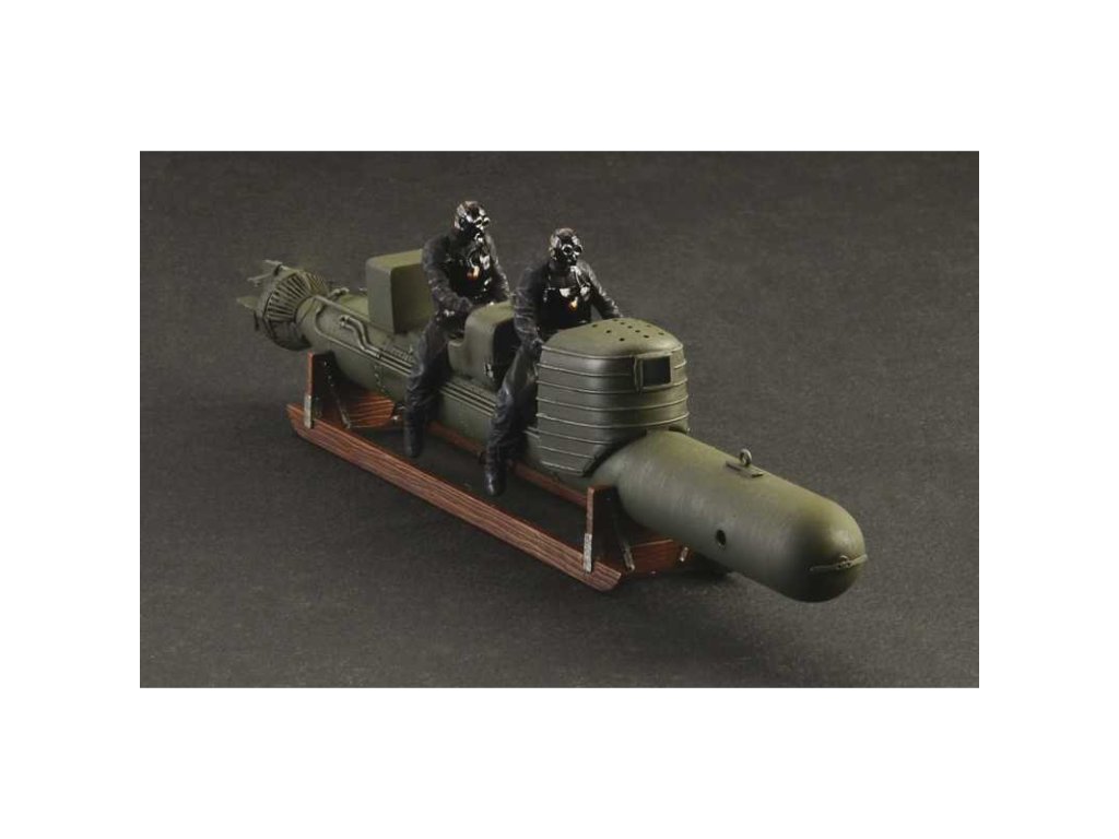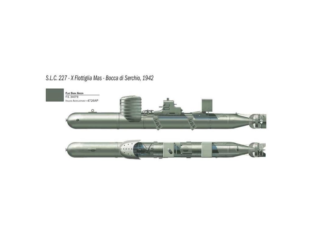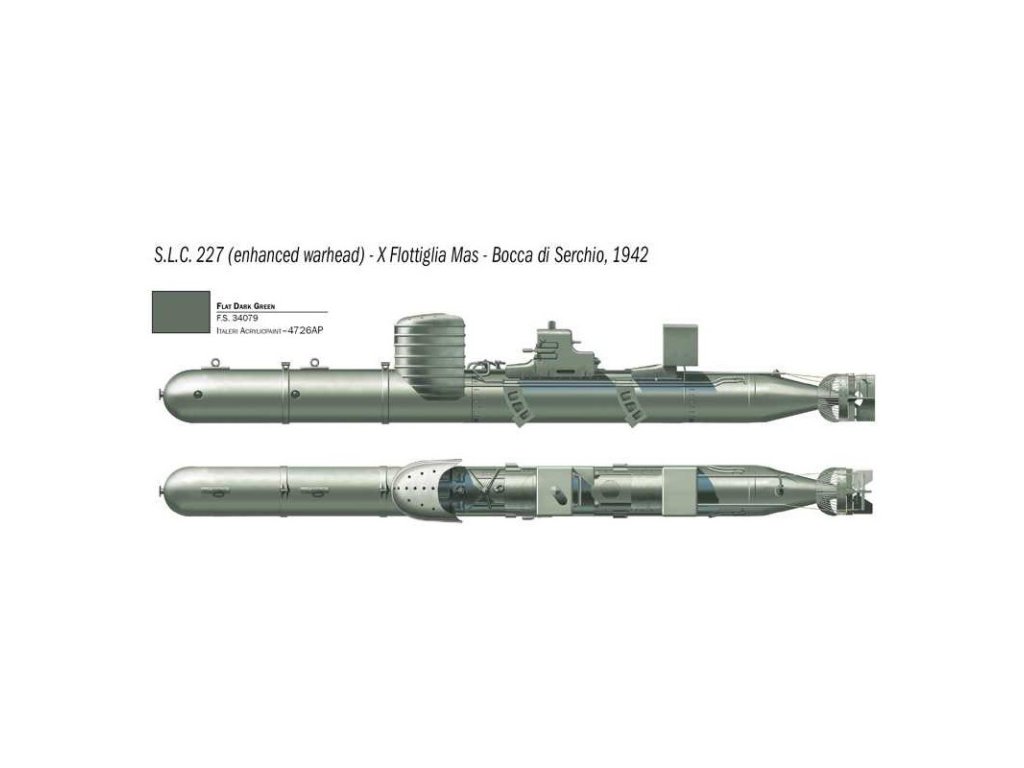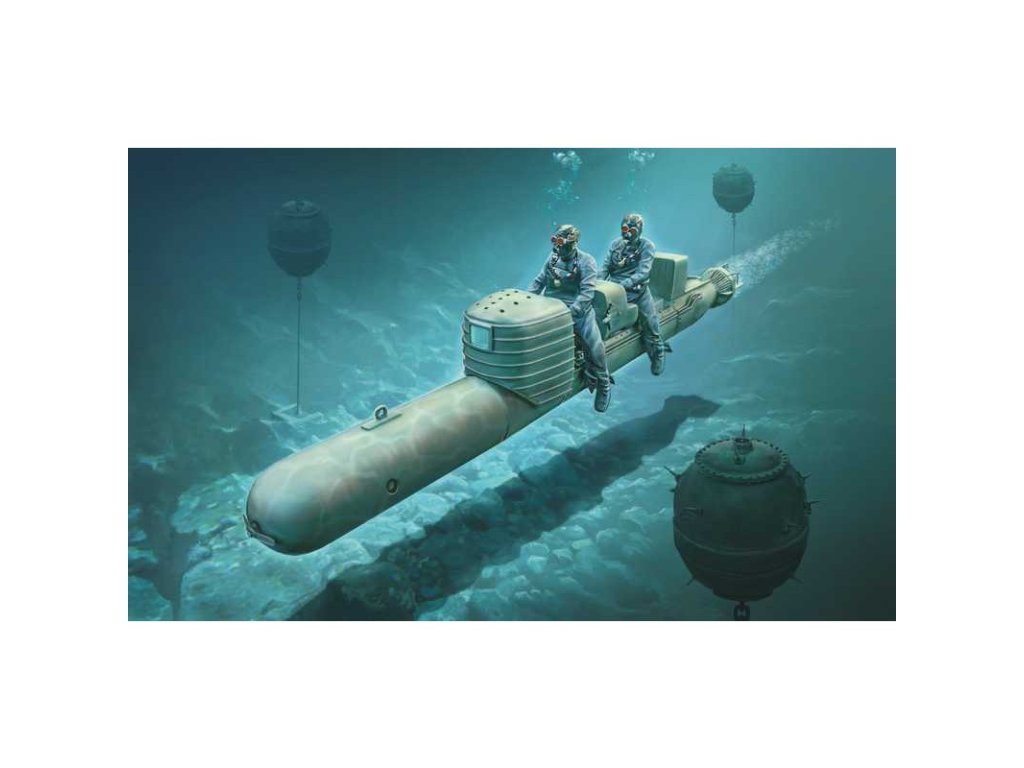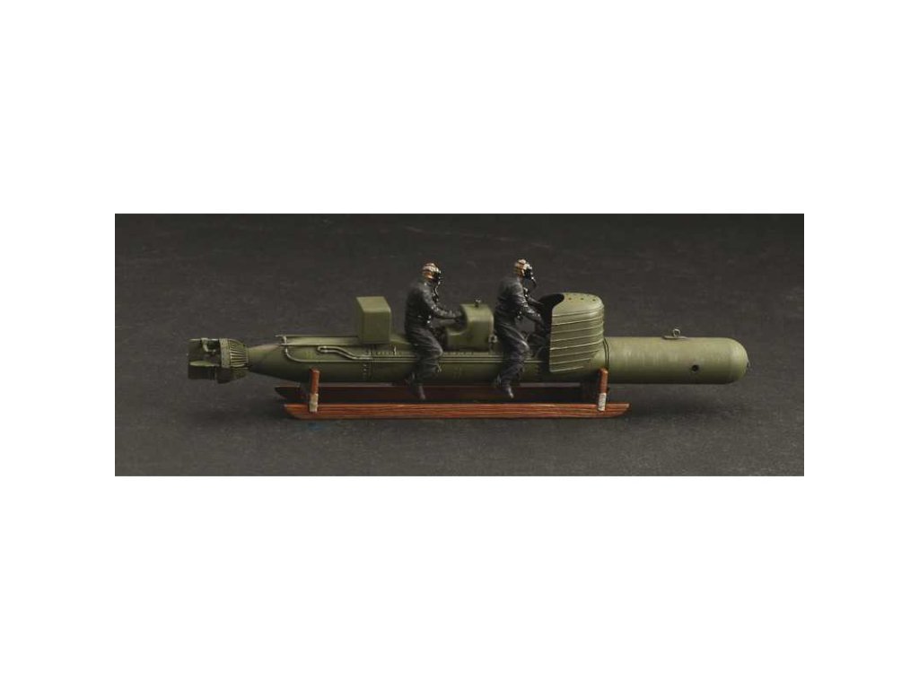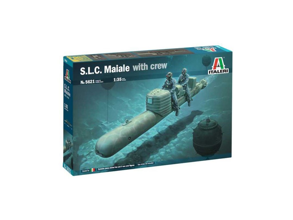 Italeri plastikový model torpéda SLC Maiale v měřítku 1:35 ke slepení. Délka modelu 198 mm, obtížnost 3. Balení obsahuje 2 postavy.