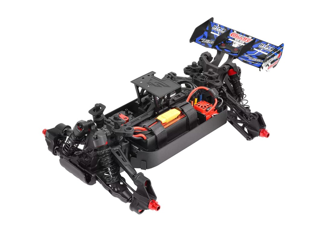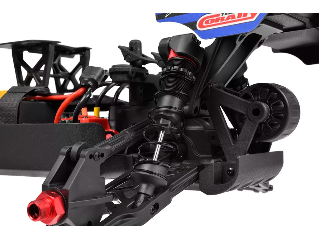 Jeho hybridní hliníkový držák motoru nabízí tři polohy motoru pro přesné nastavení vůle pastorku. Zesílené hnací ústrojí s ocelovými unašeči a robustním hlavním převodovým převodem 52T zajišťuje dlouhou životnost. Široké těhlice z Kagamy a Sketeru dodávají stabilitu a schopnosti v terénu, zatímco nové wheelie kolečko pomáhá zvládat obrovský výkon. Od střídavého motoru Kuron 725 až po regulátor Torox 135 - každá součástka přispívá ke vzrušující maximální rychlosti přes 80 km/h. Vysílač CT2S 2,4 GHz, systém vyztužení podvozku a křídlo s vysokou přítlačnou silou doplňují balíček, takže Kagama4 je skutečným důkazem odkazu inovací a výkonu firmy Team Corally.