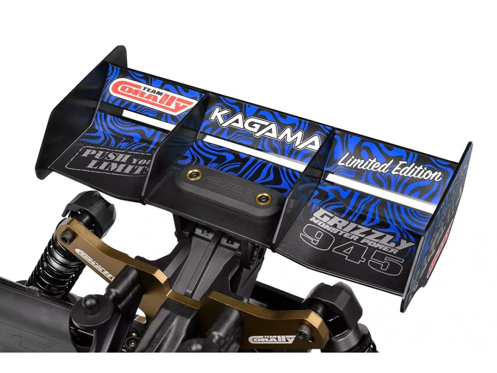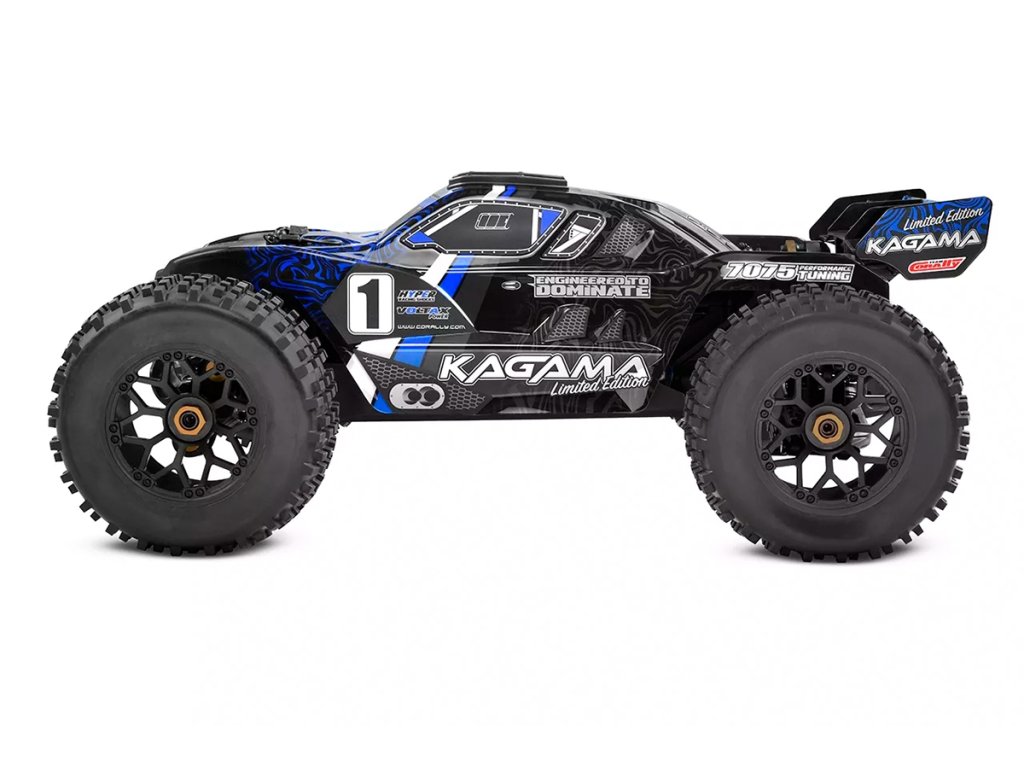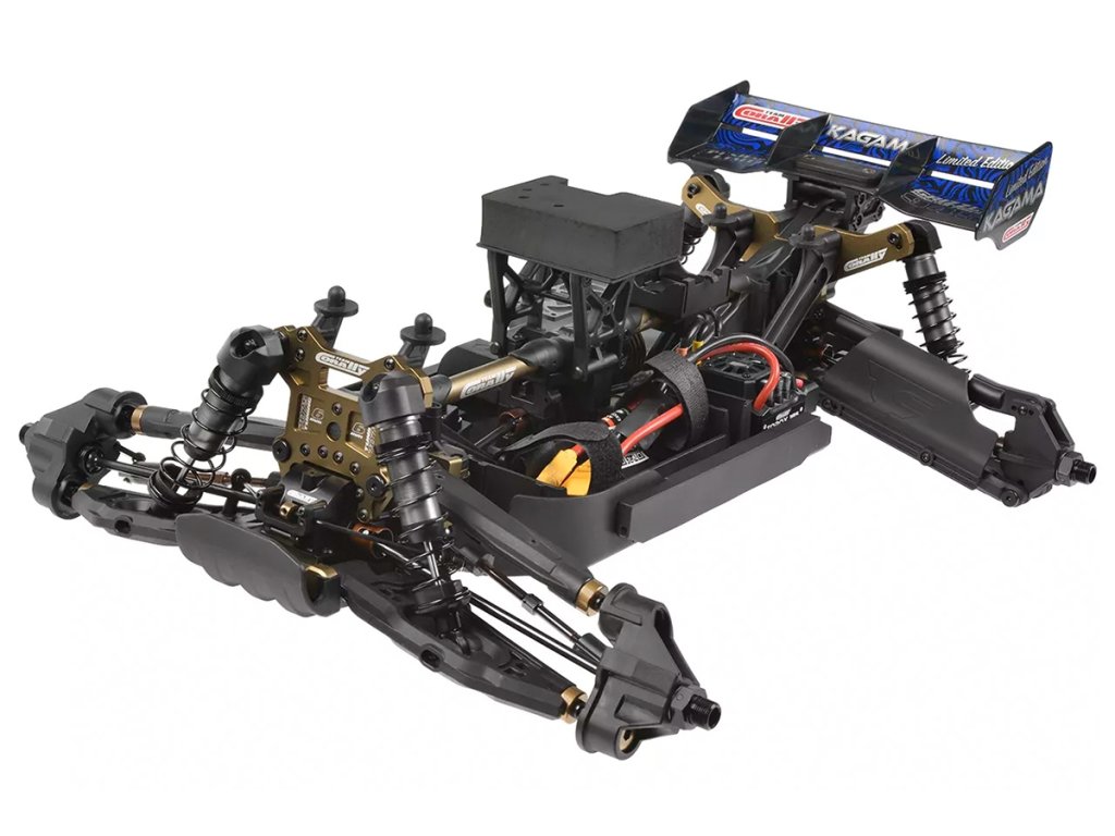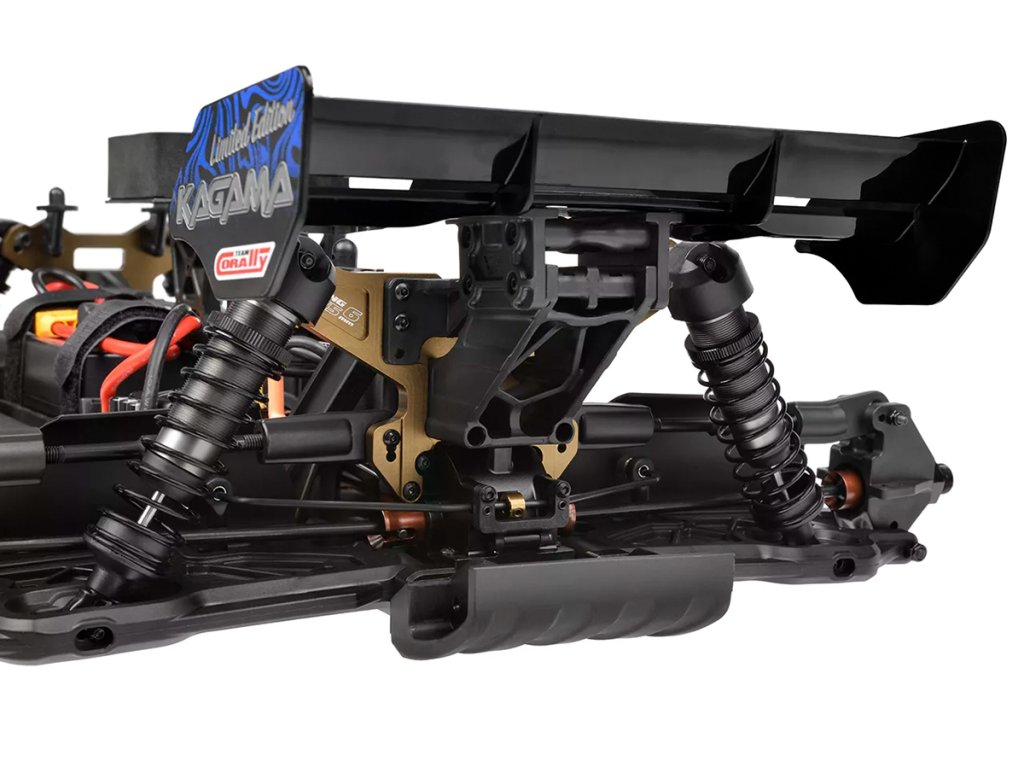 Kagama Limited Edition vylepšuje osvědčený výkon standardního modelu Kagama a zároveň zachovává jeho osvědčené komponenty. Mnoho hliníkových dílů nyní má jedinečnou eloxovanou povrchovou úpravu Limited Edition, díky čemuž je skutečně jedinečný. Podvozek, vzpěry odpružení, středový díl řízení a matice pro nastavení pivot ball čepů nyní mají exkluzivní zlatou povrchovou úpravu. Středový diferenciál, náboje kol, kroužky nastavení předpětí pružin tlumičů a páka serva mají elegantní černou eloxovanou povrchovou úpravu. Všimli jste si jich všech?