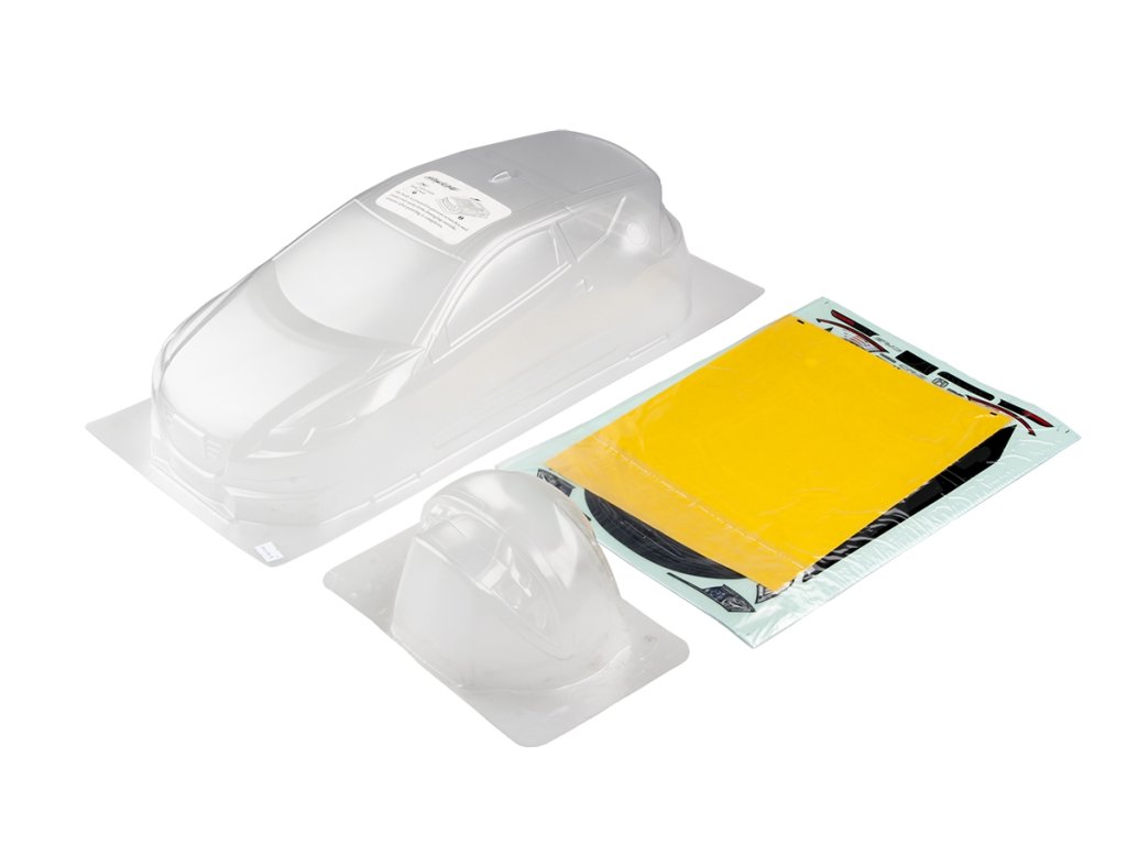 Čirá karoserie pro modely drift vč. zadního křídla, nálepek a maskovacích šablon na okna.