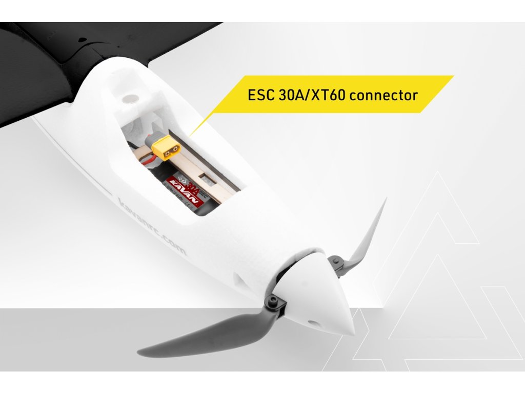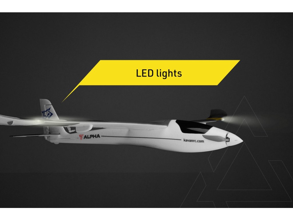 RC set obsahuje: trup vylisovaný z EPO s namontovaným střídavým motorem, sklopnou vrtulí 8,5x5", regulátorem otáček KAVAN 30A, osmikanálovým 2.4GHz FHSS přijímačem a 2 servy KAVAN GO-09, křídlo vylisované z EPO s instalovanými 2 servy KAVAN GO-09 a LED světly, ocasní plochy z EPO, ocelovou spojku křídla, osmikanálový vysílač 2.4GHz FHSS, pohonný akumulátor LiPo KAVAN 30/60C 11,1 V 1200 mAh, rychlonabíječ a podrobný návod ke stavbě a létání.