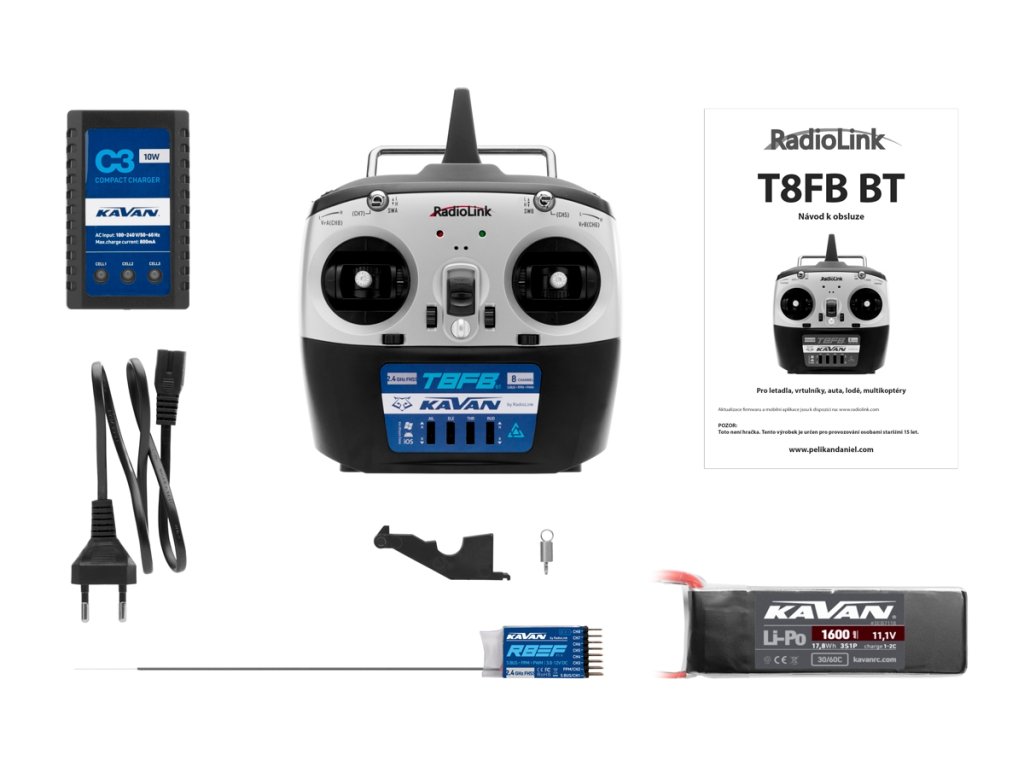 K ovládání modelu slouží osmikanálový vysílač KAVAN/RadioLink T8FB BT 2.4GHz FHSS (systém s frekvenčním přeskokem v rozprostřeném spektru) s křížovými ovladači uspořádanými v Módu 1 (plyn vpravo), trimy a přepínači smyslu výchylek pro všechny kanály. Ten můžete používat „rovnou z krabice“ jako klasický „nepočítačový“ vysílač s trimy a mechanickými přepínači smyslu výchylek pro kanály křidélek, výškovky, plynu a směrovky. Po připojení k PC či aplikaci pro smartphony s operačním systémem Android či iOS pak máte možnost nastavovat programově velikosti a smysly výchylek, používat dvojí výchylky, exponenciální průběh výchylek a další chytré funkce. Pro napájení vysílače budete potřebovat 4 AA (tužkové) alkalické baterie nebo akumulátory (nejsou součástí RC setu).