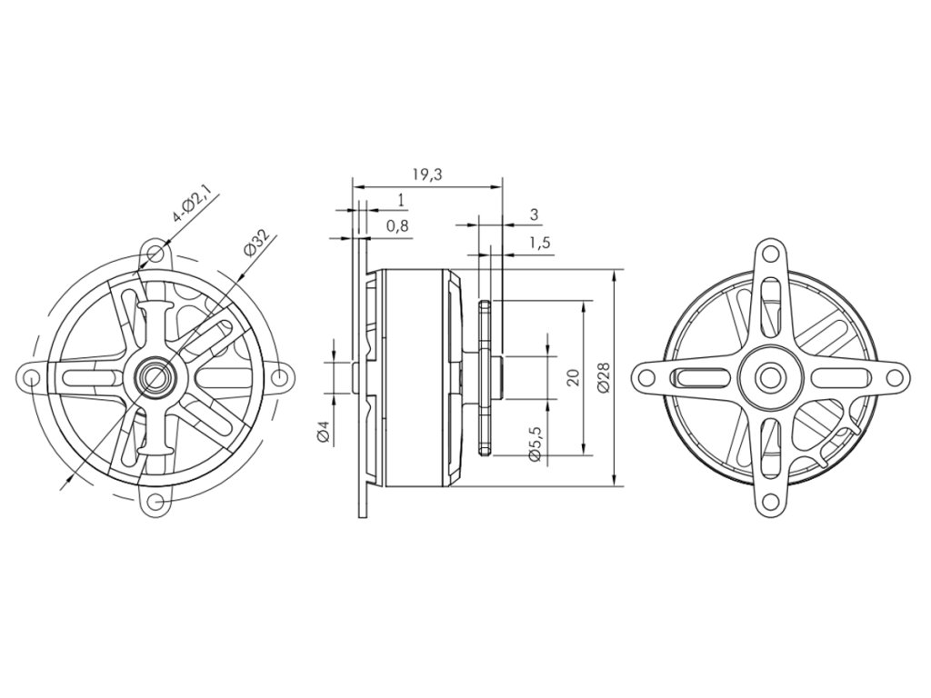 Montáž motoru: KAVAN PRO 2813-1500 je konstruován pro zadní montáž s vrtulí upevněnou pomocí gumičkového unašeče (Ø5,5 mm). Při montáži použijte nejméně dva (protilehlé), nebo čtyři šrouby M2. Motorová přepážka by měla být z 1-1,5 mm letecké překližky. Upevňovací kříž je součástí motoru.