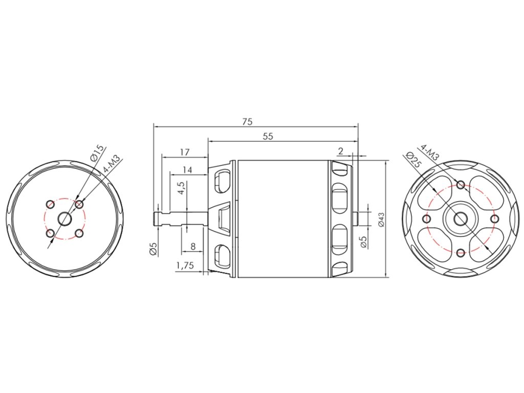 Montáž motoru: KAVAN PRO 4355-700 je konstruován pro přední i zadní montáž. Při přední montáži za čelo motoru použijte čtyři šrouby M3, které zasahují do čela motoru v rozmezí 4-5 mm. Motorová přepážka by měla být z 6 mm letecké překližky. Sada pro zadní montáž (upevňovací kříž, unašeč vrtule pro zadní montáž) je dodávána spolu s motorem.