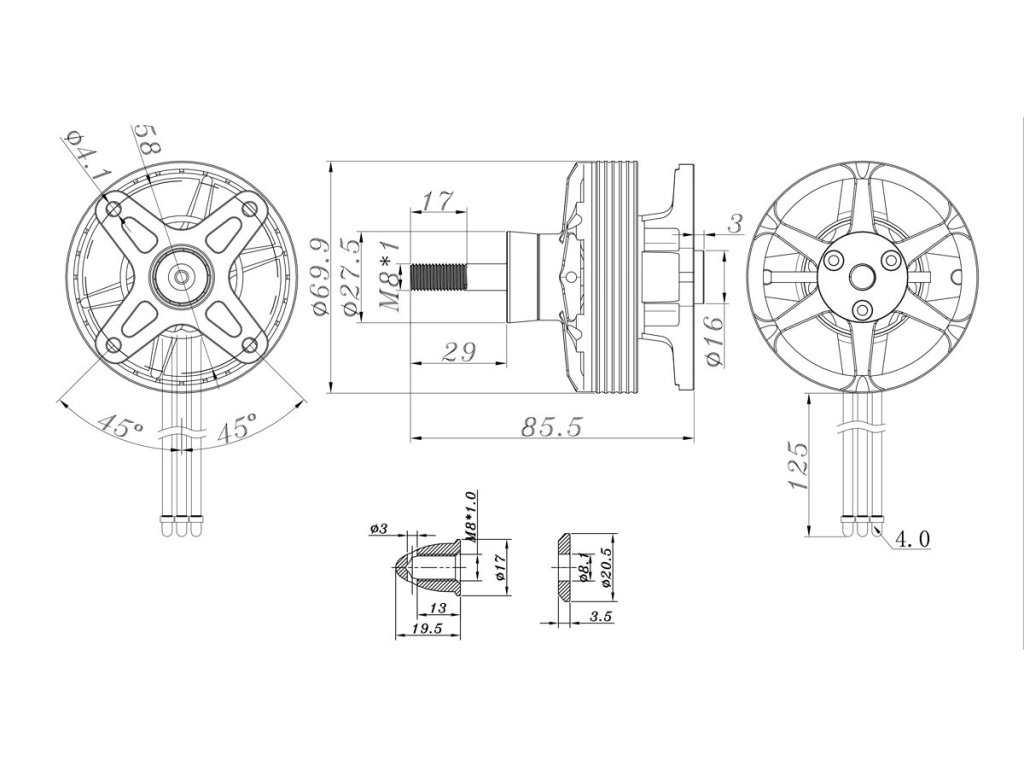 Montáž motoru: KAVAN PRO 7025-510 je konstruován pro zadní montáž; upevňovací kříž je integrální součástí motoru. Pro upevnění použijte čtyři ocelové šrouby M4; motorová přepážka by měla být z 6-8 mm letecké překližky.