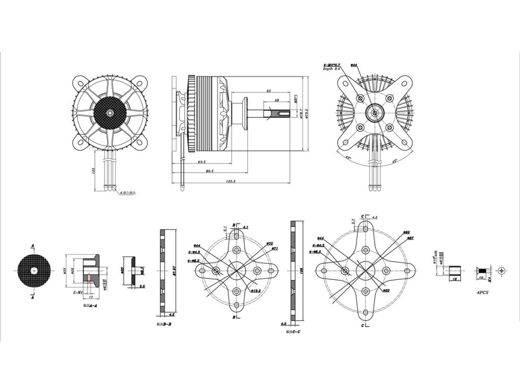 Montáž motoru: KAVAN PRO PRO 8045-215 je konstruován pro zadní montáž. Pro upevnění použijte čtyři ocelové šrouby M4; motorová přepážka by měla být z 8-10 mm letecké překližky.