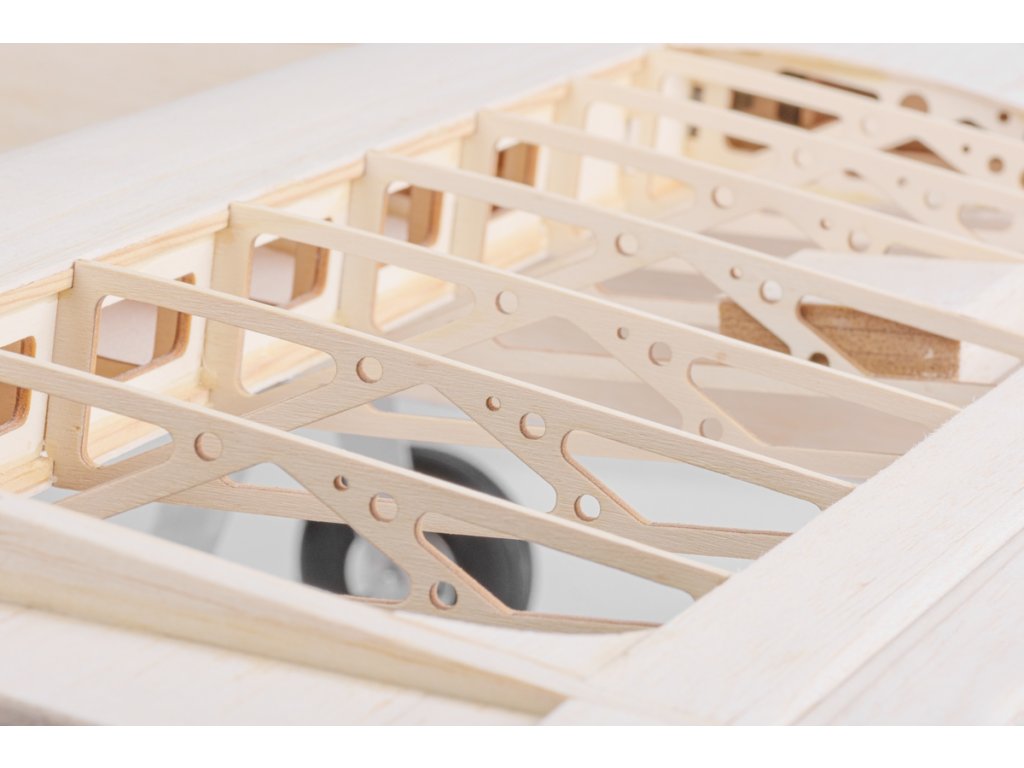Jednodílné křídlo se souměrným profilem je klasické konstrukce s balsovými žebry a tuhým potahem torzní skříně. K trupu se upevňuje dvěma plastovými šrouby. Stavbu opět usnadňuje použití laserem vyřezávaných dílů se zářezy a výstupky v „puzzle“ stylu, díky níž sestavíte vše správně a nezkrouceně bez potřeby stavebních přípravků. Křidélka po celém rozpětí křídla jsou ovládána dvěma mikroservy s krátkými přímými drátovými táhly. Konstrukce křídla umožňuje táhla a páky křidélek umístit na spodní stranu křídla (vhodné pro létání s podvozkem) nebo na horní stranu křídla (vhodné pro létání bez podvozku s přistáním na břicho do trávy).