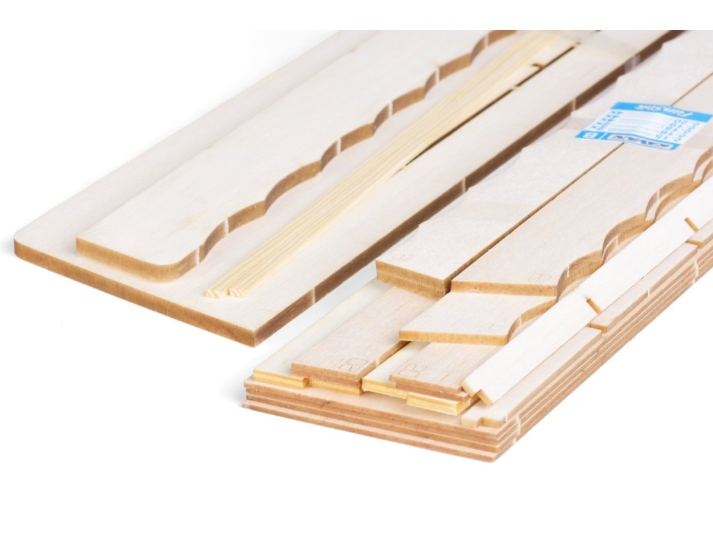 Stavebnice obsahuje: laserem vyřezávané balsové a překližkové díly, smrkové nosníky, balsové nosníky a prkénka na tuhý potah, sadu příslušenství, duralový podvozek, lehká kola, arch samolepících obtisků, stavební plán a návod.