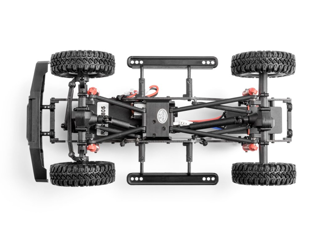 Pevný kovový rám spolu s 4bodovým zavěšením náprav a měkkými tlumiči zajišťuje dostatečnou světlou výšku, nájezdové úhly a artikulaci pro překonávání překážek a nástrah při venkovním ježdění. Stálý náhon všech kol, uzavřené diferenciály a měkké pneumatiky s hlubokým vzorkem vždy zaručí dostatek trakce.