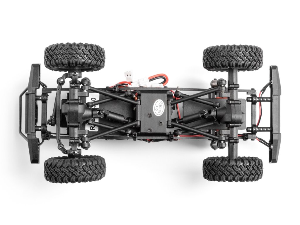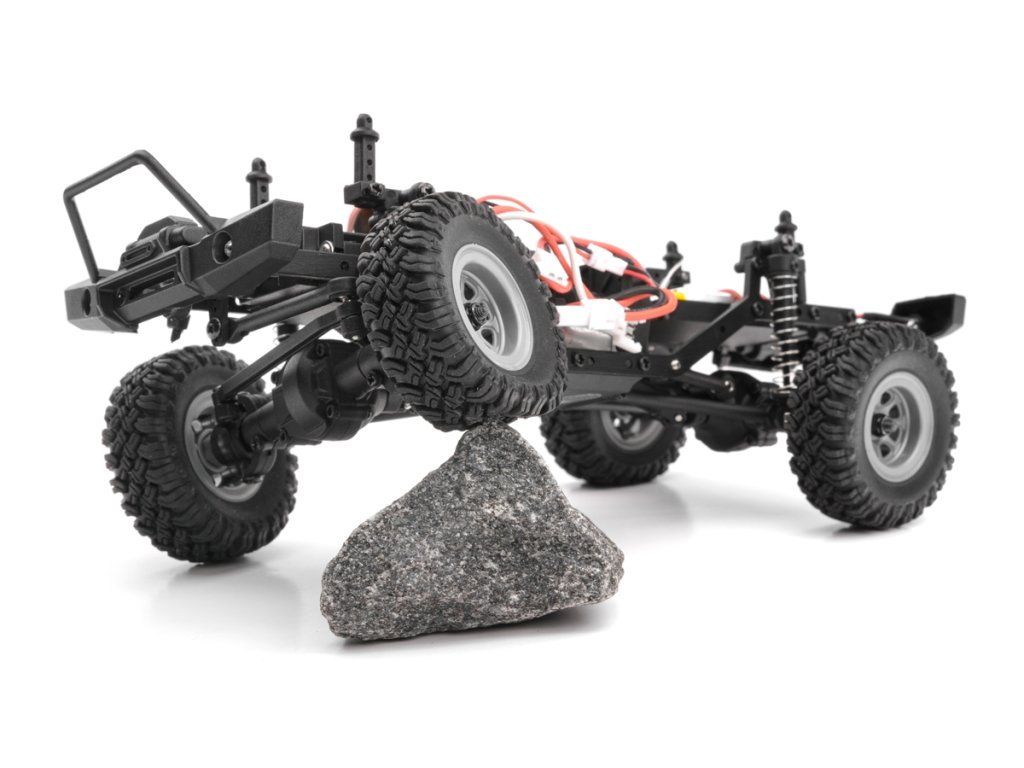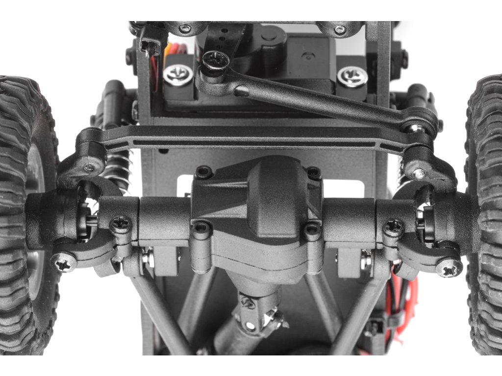 Pevný kovový rám spolu s 4bodovým zavěšením náprav a měkkými tlumiči poskytuje dostatečnou světlou výšku, nájezdové úhly a artikulaci pro překonávání náročných překážek. Stálý náhon všech kol, uzavřené diferenciály a měkké pneumatiky s hlubokým vzorkem vždy zaručí dostatek trakce.