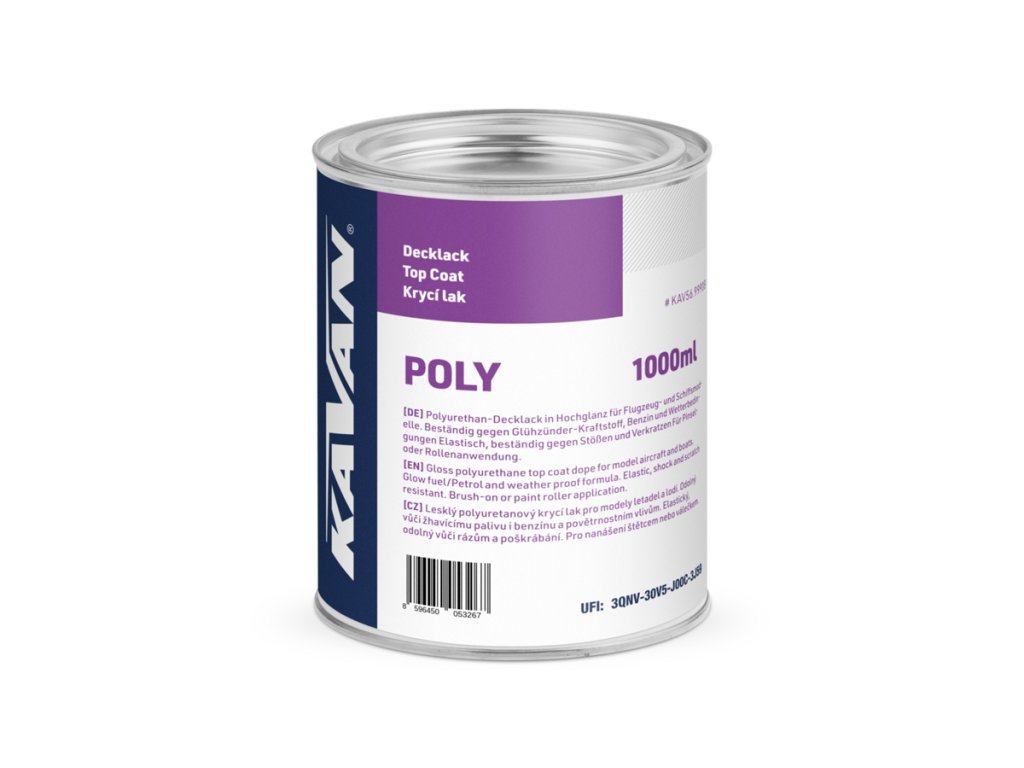 Vhodné pro: Horní krycí lesklá vrstvu lakovaných potahových papírů a pláten, impregnaci dřevěných částí modelů letadel a lodí proti vlhkosti. Krycí lak POLY je možné bezpečně nanášet na podklad natřený laky KAVAN řad STANDARD, COLOR a CLASSIC, jehož poslední vrstva nebyla nanesena dříve než před 24 hodinami. Pokud je podklad natřen jinými nátěrovými hmotami, důrazně doporučujeme kompatibilitu s krycím lakem POLY předem vyzkoušet mimo model.