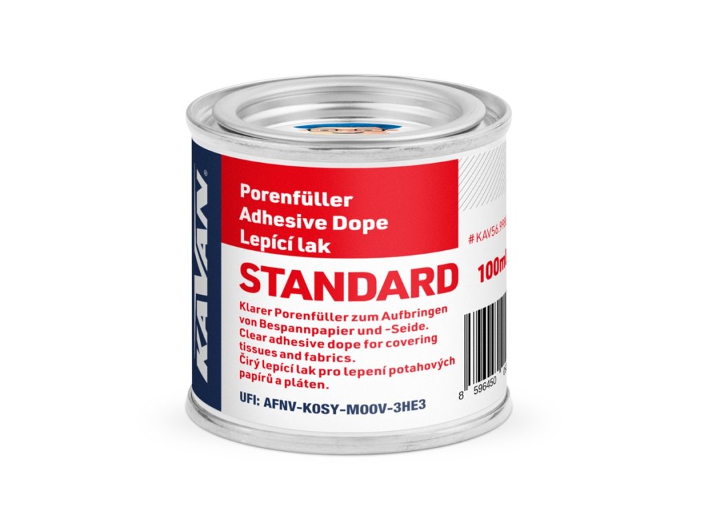 Použití: Zpravidla se nanáší neředěný (je-li třeba, použijte KAVAN Ředidlo STANDARD); na kostru nanášejte měkkým plochým štětcem nebo válečkem. Ihned přitiskněte a přihlaďte potahový papír nebo plátno; případné vzduchové bubliny odstraňte štětcem nebo válečkem. Nechejte vyschnout nejméně 24 hodin a přebruste jemným brusným papírem 600–1000. Při použití na modelu se spalovacím motorem je nutno nanést vrchní krycí vrstvu odolnou vůči palivu (např. KAV56.9990 KAVAN krycí lak POLY, 5MA4401 RC Color bezbarvý lak ve spreji).