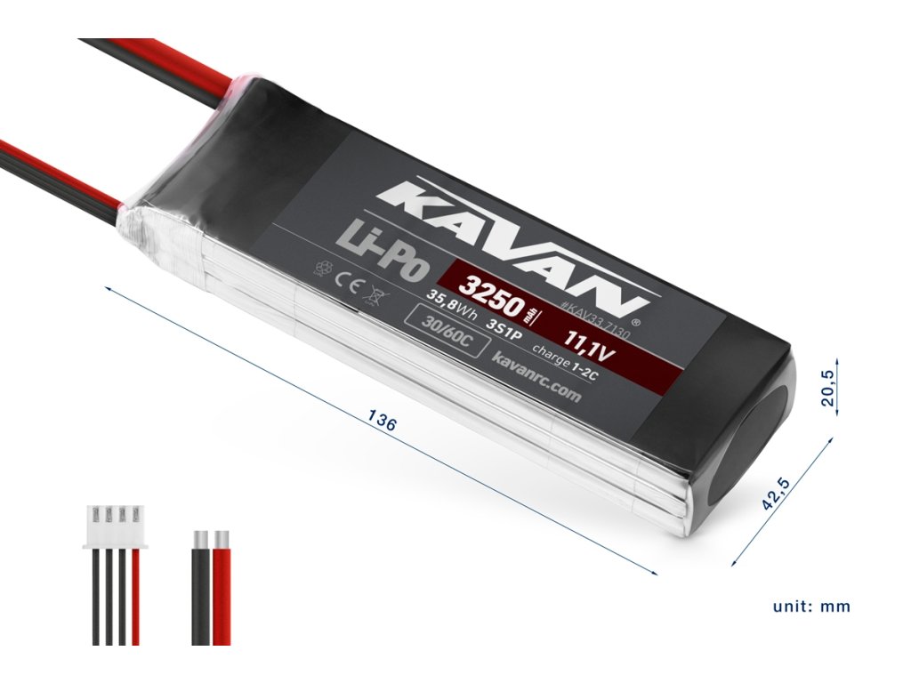 Lithiumpolymerové akumulátory KAVAN řady 30/60C spolehlivě pokrývají potřeby rekreačního modeláře: mají maximální vybíjecí proud 30C, možnost rychlého nabíjení 2C, širokou škálu kapacit (350-3250 mAh), výbornou dlouhodobou životnost a příznivou cenu.