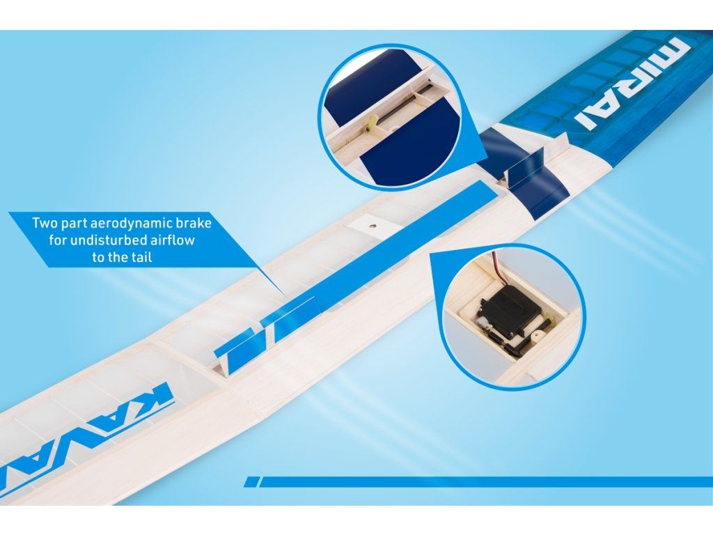 Stavebnice vysokovýkonného termického větroně klasické velmi lehké celobalsové konstrukce v rozsypu, který můžete také snadno upravit pro pohon 150-200W střídavým elektromotorem. MIRAI V je ideálním projektem pro modeláře, který si chce postavit opravdu výkonný model pro soutěžní nebo rekreační létání. Díky promyšlené konstrukci s CNC vyřezávanými díly opatřenými výstupky a zářezy, které do sebe zapadají jako díly puzzle skládačky, jde stavba velmi rychle a snadno. MIRAI V je „soutěžní plnokrevník“, s nímž můžete úspěšně bojovat o místa „na bedně“ v kategorii F3-RES nebo F5-RES. Stavebnice obsahuje díly trupu pro čistý větroň i elektrolet.