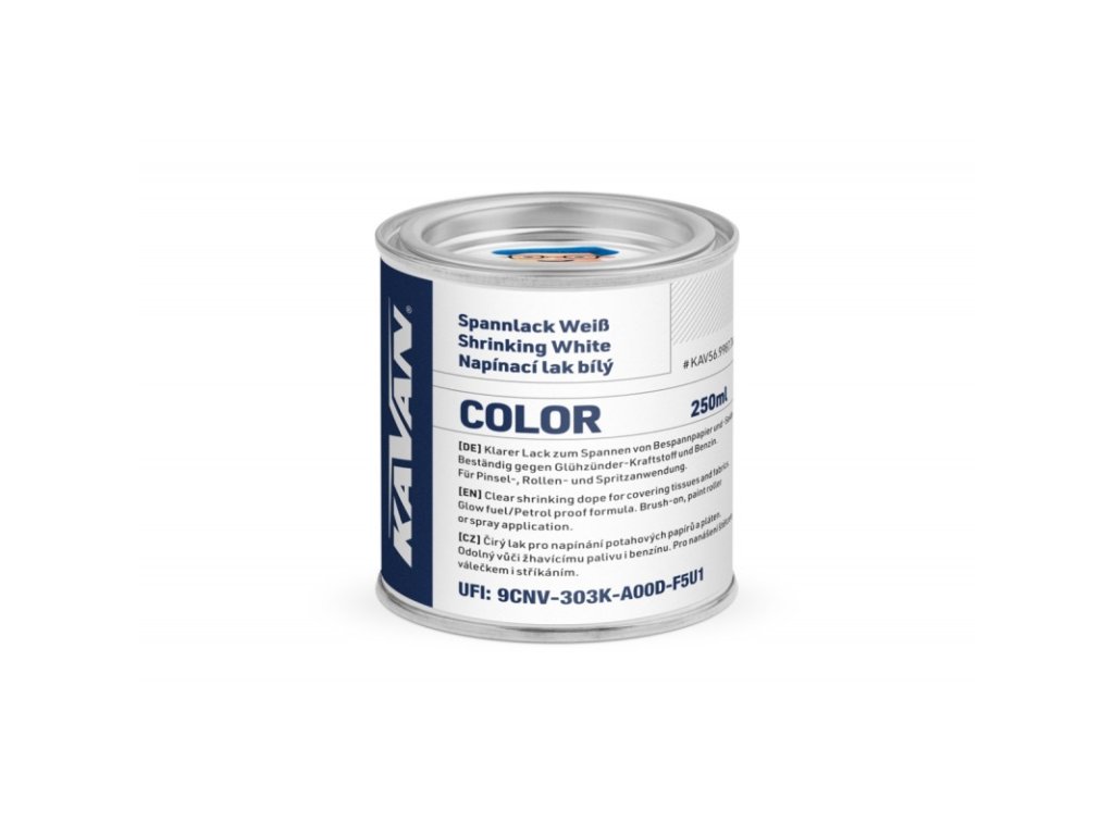 Bílý nitrolak pro napínání potahových papírů a pláten odolný vůči žhavícímu palivu i benzínu. Pro nanášení štětcem, válečkem nebo stříkáním.