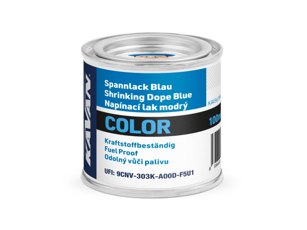 Modrý nitrolak pro napínání potahových papírů a pláten odolný vůči žhavícímu palivu i benzínu. Pro nanášení štětcem, válečkem nebo stříkáním.