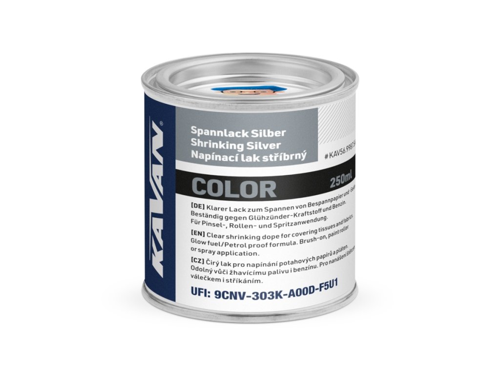 Stříbrný nitrolak pro napínání potahových papírů a pláten odolný vůči žhavícímu palivu i benzínu. Pro nanášení štětcem, válečkem nebo stříkáním.