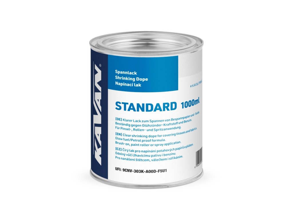Použití: Lak dle potřeby nařeďte KAVAN Ředidlem STANDARD; na potah nanášejte měkkým plochým štětcem (nejvhodnější), válečkem nebo stříkáním. Naneste 2–5 vrstev; nátěr vždy nechejte vyschnout nejméně 24 hodin a přebruste jemným brusným papírem 600–1000. Při použití na modelu se spalovacím motorem není nutno nanášet dodatečnou vrchní krycí vrstvu odolnou vůči palivu, ale jedna nebo dvě vrstvy elastického polyuretanového laku KAV56.9990 KAVAN krycí lak POLY výrazně zvýší odolnost vůči mechanickému poškození.