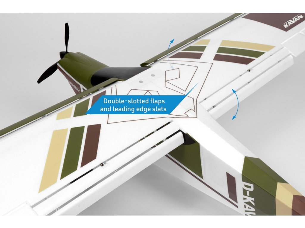 Křídlo modelu z pěnového EPO je dvojdílné s uhlíkovými nosníky a uhlíkovou trubkovou spojkou. Na místě je zajištěno šrouby. Křidélka i dvouštěrbinové Fowlerovy klapky (se spřaženými sloty na náběžné hraně) jsou ovládány nezávisle vždy dvěma servy s krátkými přímými drátovými táhly a nechybí ani funkční poziční LED světla. Snadno demontovatelné uhlíkové vzpěry křídla jsou zajištěny na místě páry drátových sponek.