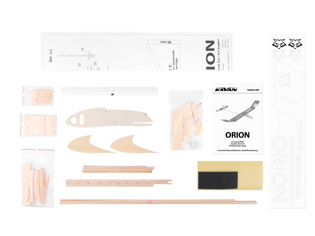 Větroň kategorie A3 s konstrukčními nosnými plochami potahovanými papírem. Orion je jednoduchý, ale výkonný model s křídlem s klenutým profilem pro mírně pokročilé navazující na Kikinu, Harryho, Trempíka, Robina nebo Kose, který umožní dále rozvíjet základní modelářské dovednosti. Kromě hodu z ruky lze model díky nastavitelnému bočnímu háčku úspěšně vlekat na 25 m lanku (silonovém vlasci). S Orionem se v žákovských soutěžích kategorie A3 určitě neztratíte. Stejně tak si s ním dříve narození mohou se slzou v oku zavzpomínat na modelářské začátky kdysi v temném dávnověku minulého století...