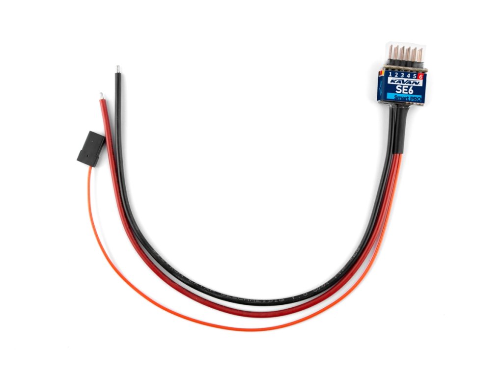 KAVAN Smart PRO SE6 je dekodér/expandér, které převádí vstupní signál sériové sběrnice na standardní servo výstupy (PWM). Nabízí až šest konfigurovatelných výstupů pro serva s volitelnou periodou a nastavením fail-safe. SE6 je perfektní volbou pro modely se složitou mechanikou křídel nebo ocasních ploch, kde je možné k primárnímu přijímači připojit více serv pomocí jediného kabelu. Pokud vám docházejí kanály na přijímači, jednoduše připojte SE6 k sériové lince z přijímače a libovolně přiřaďte své vlastní výstupní kanály. SE6 nemá vstupní konektor.