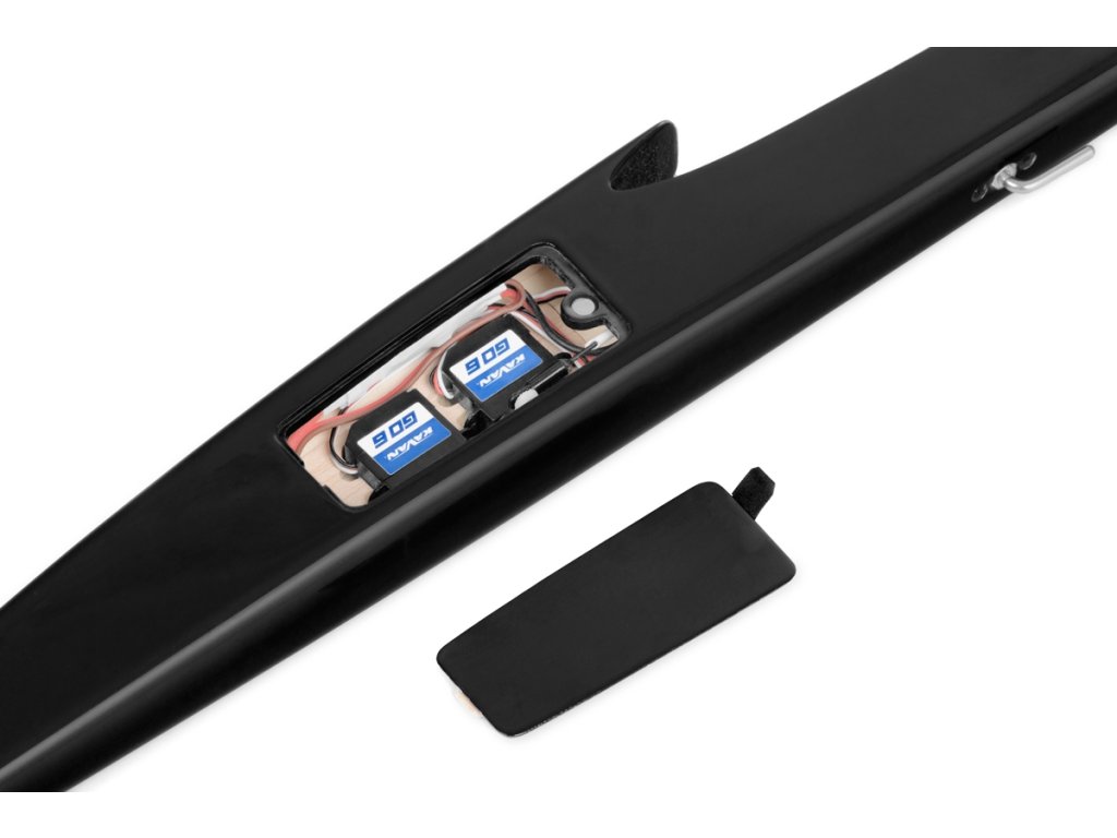 Ocasní plochy jsou deskové, lepené z CNC vyřezávaných balsových dílů. Kormidla jsou ovládána drátovými lanovody.