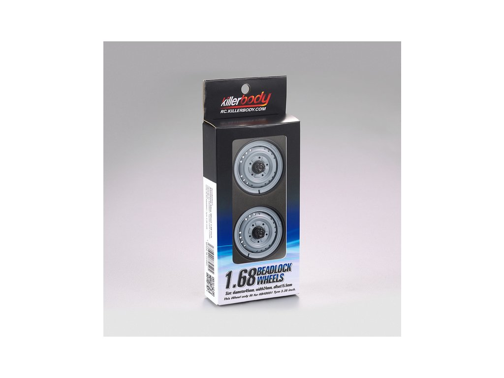 Killerbody Vám nabízí hliníkové disky 1.68" vhodné pro RC modely aut 1:10. Disky mají průměr 45 mm, šířka 24 mm, ofset 15,5 mm. Jsou vyrobeny ze slitiny hliníku, v šedém a černém provedení. Disky se hodí k pneumatikám KB48691.