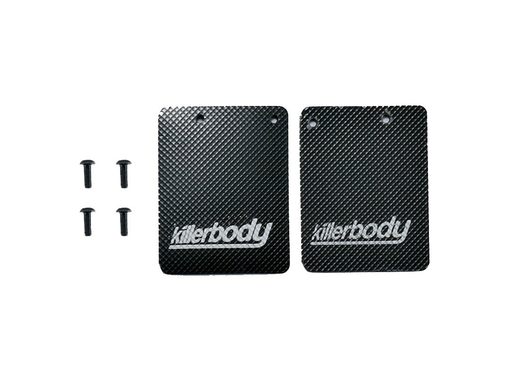 Černé gumové zástěrky pro RC model auta. Balení obsahuje 2 ks s logem Killerbody 43 x 55 mm, šroubky na připevnění.