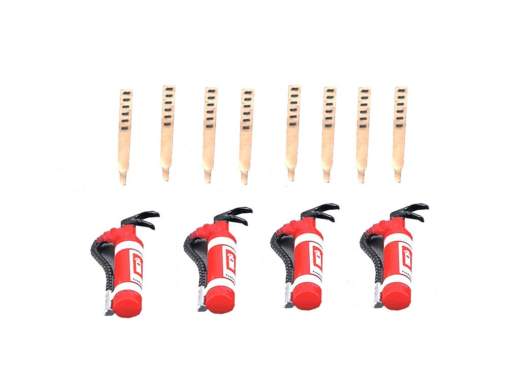 Balení obsahuje: 4 x hasičský přístroj ( nutno sestavit ), 8x mosazný pásek pro upevnění, připravené samolepky na nalepení, obrázkový návod.