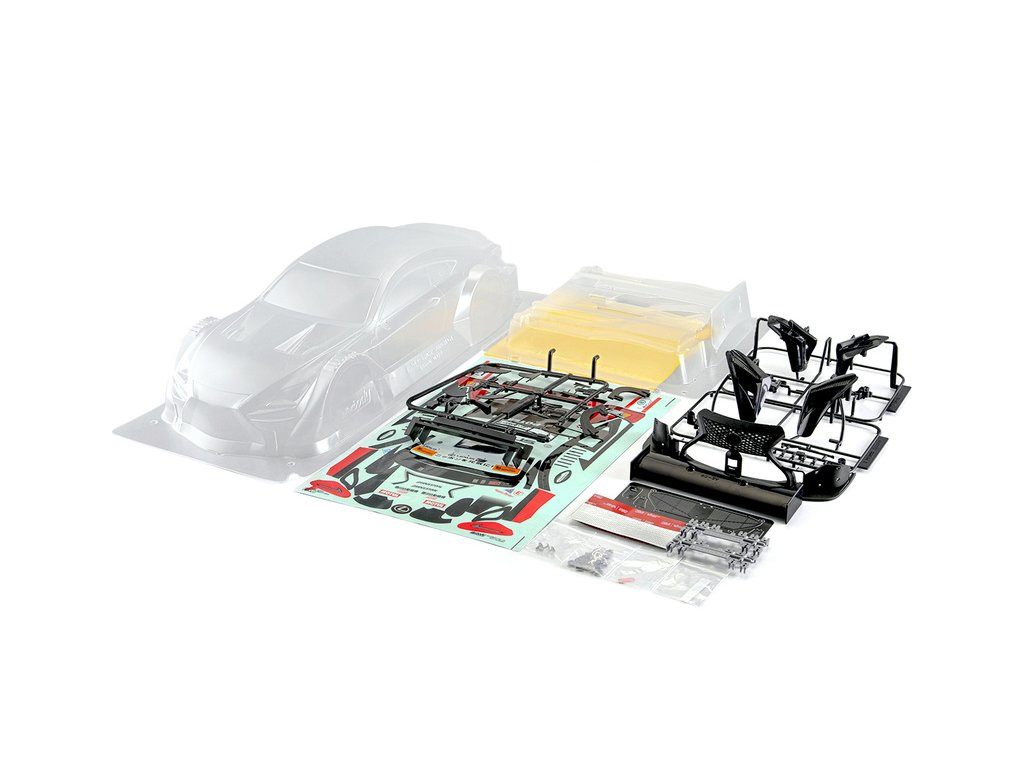 Obsahem balení je čirá karoserie 1:10 Denso Kobelco Sard, bohaté příslušenství - masky oken, nálepky, plastové ABS díly (světla a držáky světel, výfuk, stěrače, víčko nádrže), přední/zadní spoiler, anténa, zadní křídlo a ostatní příslušenství (sada šroubků, oboustranná lepící páska, hliníková pásk... ), obrázkový návod.
