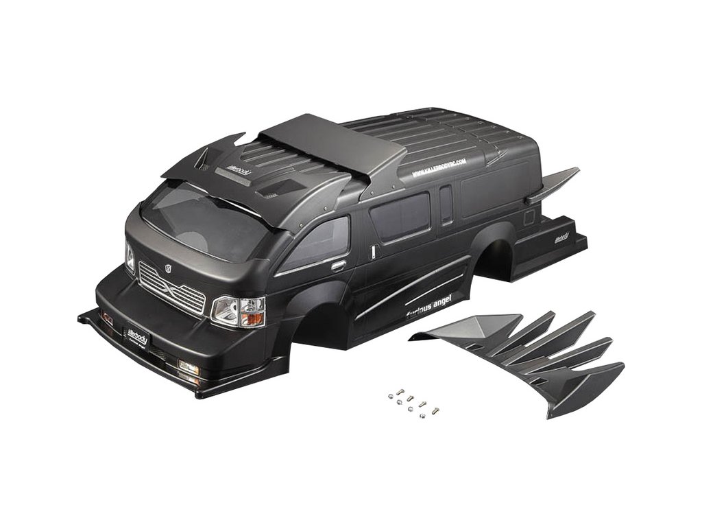 Karosérie Furious Angel v černé barvě je již sestavena. Jen otvory pro připevnění karosérie je nutno dodělat. Karosérie je aerodynamicky zpracovaná a inspirovaná bláznivým japonským tuningem.