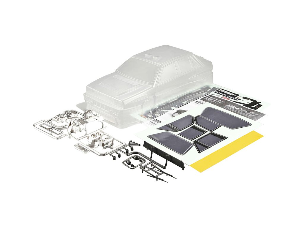 Obsahem balení je nenabarvená karosérie pro RC modely aut 1:10 Lancia Delta HF Integrale 16V od Killerbody, spousta příslušenství - masky oken, sada chromovaných i plastových dílů, arch samolepek, obrázkový návod.