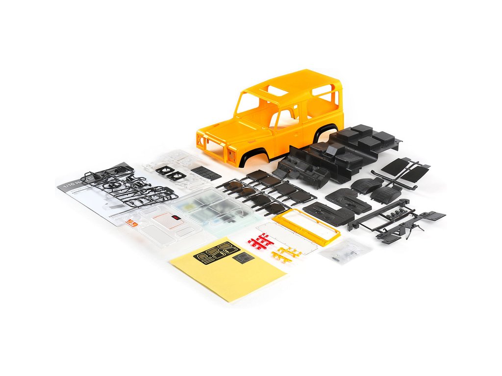 Maketa karosérie Killerbody Land Rover Defender 90 v měřítku 1:10, barva žlutá. Interiér je vybaven sedačkami, přístrojovou deskou, volantem a příslušenstvím. Samolepky.