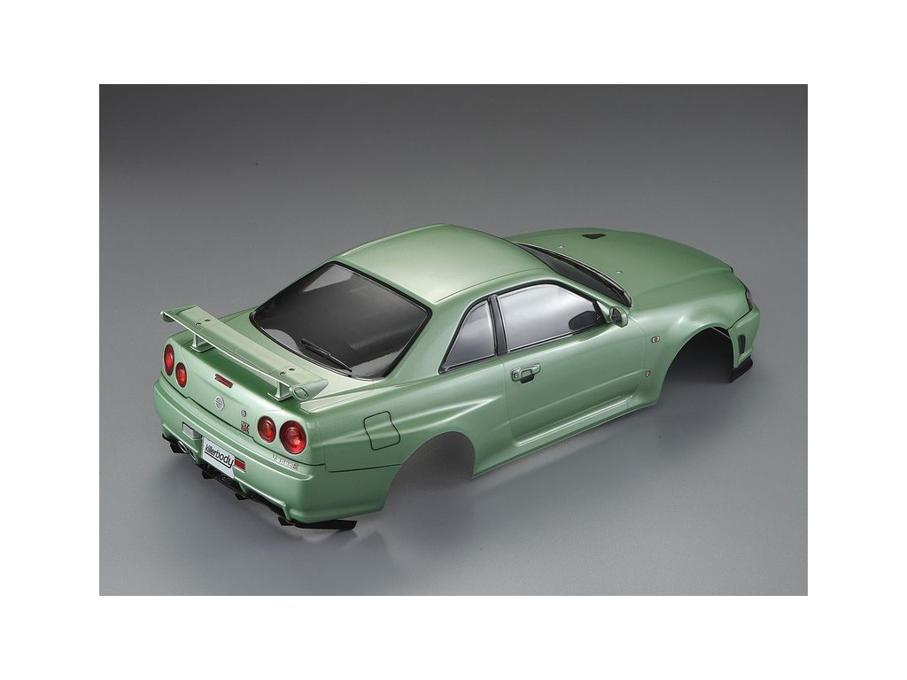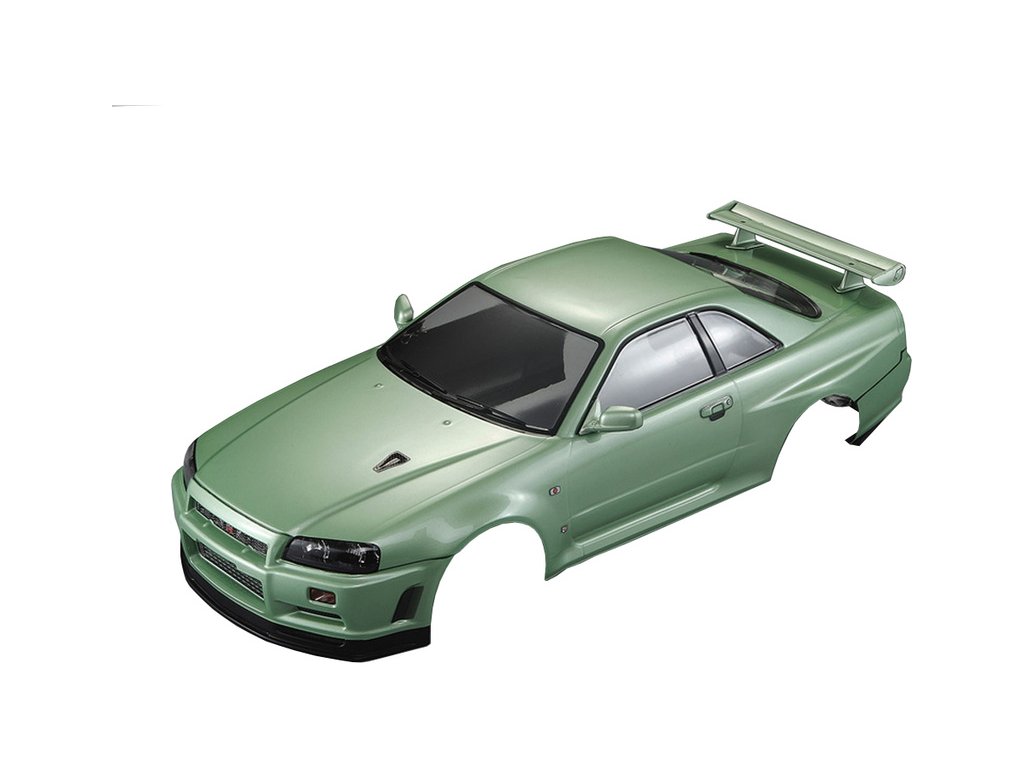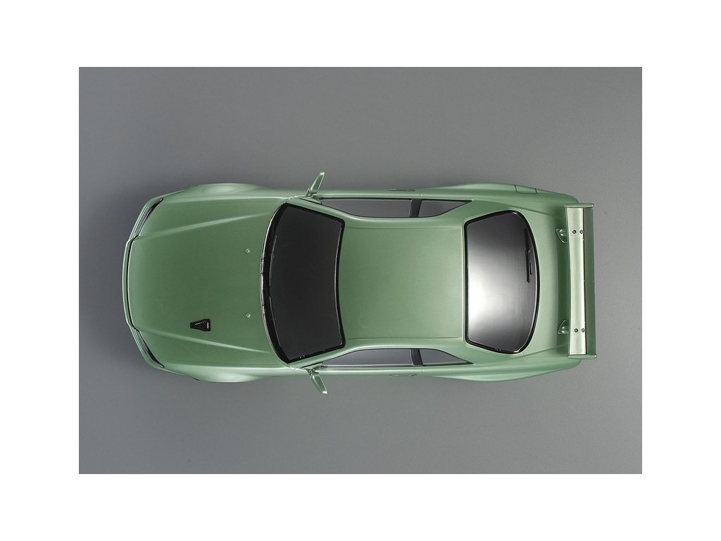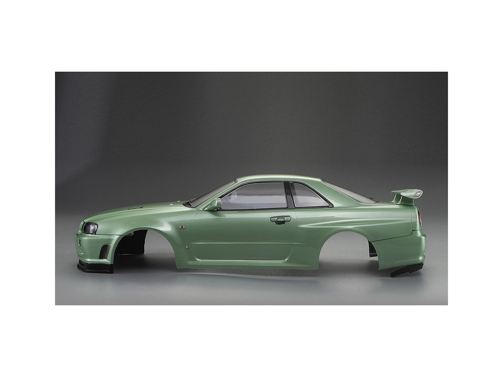 Karosérie Nissan Skyline R34 v zelené barvě je již sestavena. Jen otvory pro připevnění karosérie je nutno dodělat dle potřeby. Aerodynamické a elegantní zpracování karosérie auta vás určitě nezklame.