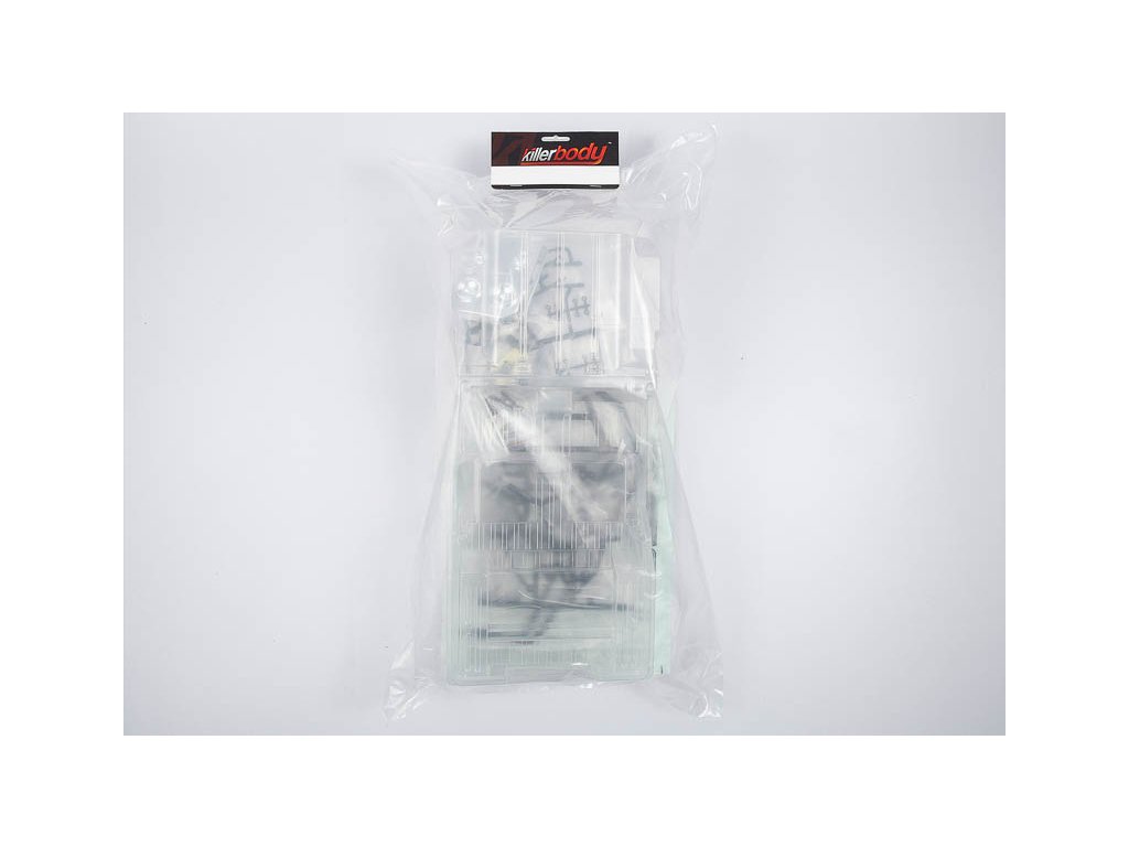 Obsahem balení je nenabarvená karosérie pro RC modely aut 1:10 Warrior ( replika auta Ford Mutt M151 ) od Killerbody, spousta příslušenství - masky oken, sada chromovaných i plastových dílů, arch samolepek, obrázkový návod.