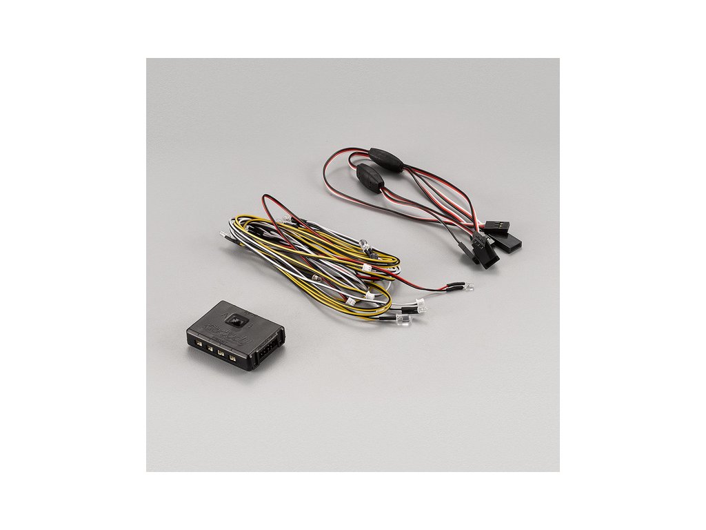 Balení obsahuje: řídící jednotku, 2 x 3 oranžové LED diody, 1 x 2 červené, LED diody, 3 x 2 bílé LED diody, 2 x Y-kabely - Rx/servo, Rx/regulátor. Originální a český návod.