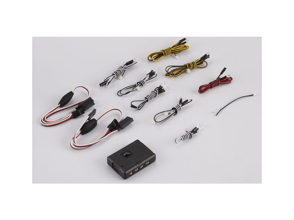 Balení obsahuje: řídící jednotku, 2 x 3 oranžové LED diody, 1 x 2 červené, LED diody, 5 x bílé LED diody celkem 9 ks, 2 x Y-kabely - Rx/servo, Rx/regulátor. Originální a český návod.