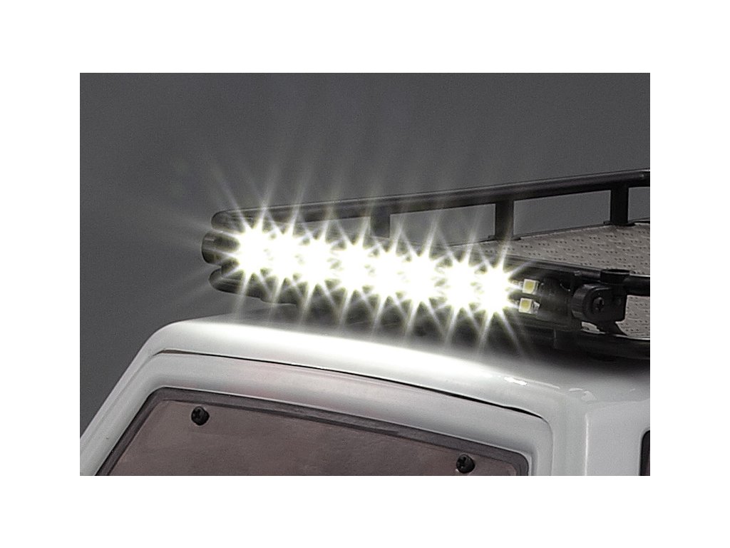 Díky zadní lepící straně pásu se dá lehce připevnit k černému plastovému rámu. Ten se pomocí montážní sady přidělá třeba ke střešnímu nosiči na karoserii modelu auta. LED pás obsahuje 18 diod, které svítí bíle.