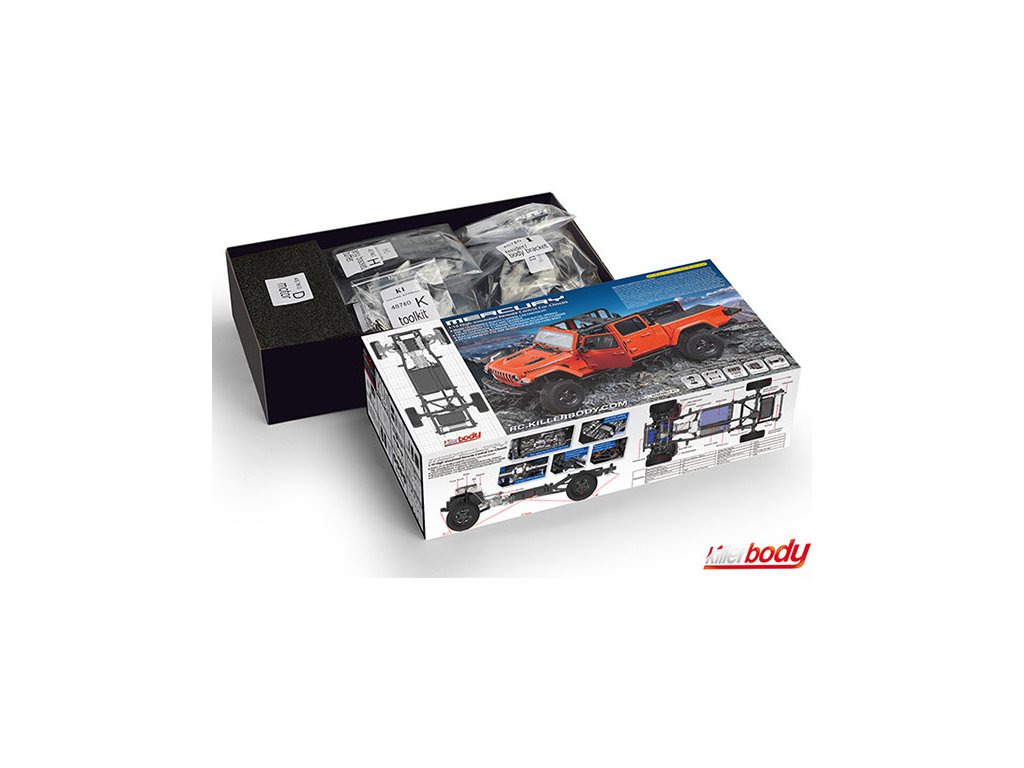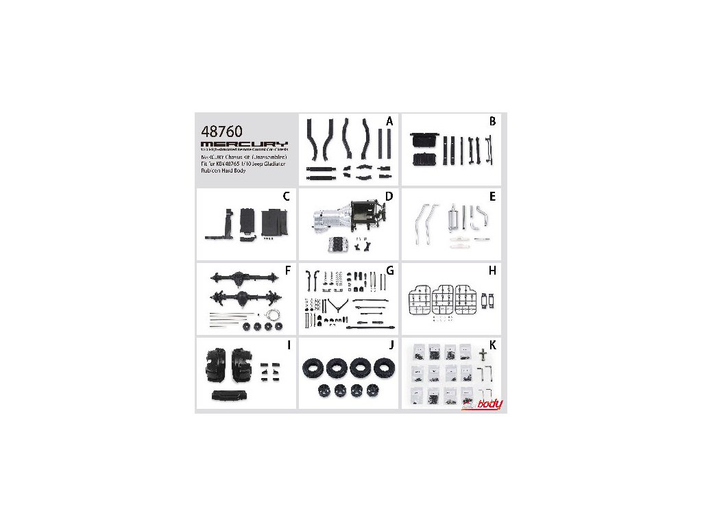 Stavebnice šasi RC modelu auta Killerbody Mercury 1:10, pro karoserii Killerbody Jeep Gladiator Rubicon. Konstrukce je navržena tak, aby se jednotlivé komponenty elektroniky skryly. Lože stejnosměrného motoru 540 je v maketě motoru V6, přijímač a regulátor mají místo nad předními blatníky a prostor pro pohonnou baterii je v maketě palivové nádrže. Další rezervované místo pro případnou jednotku osvětlení a jednotku kouřového efektu je v zadní části.