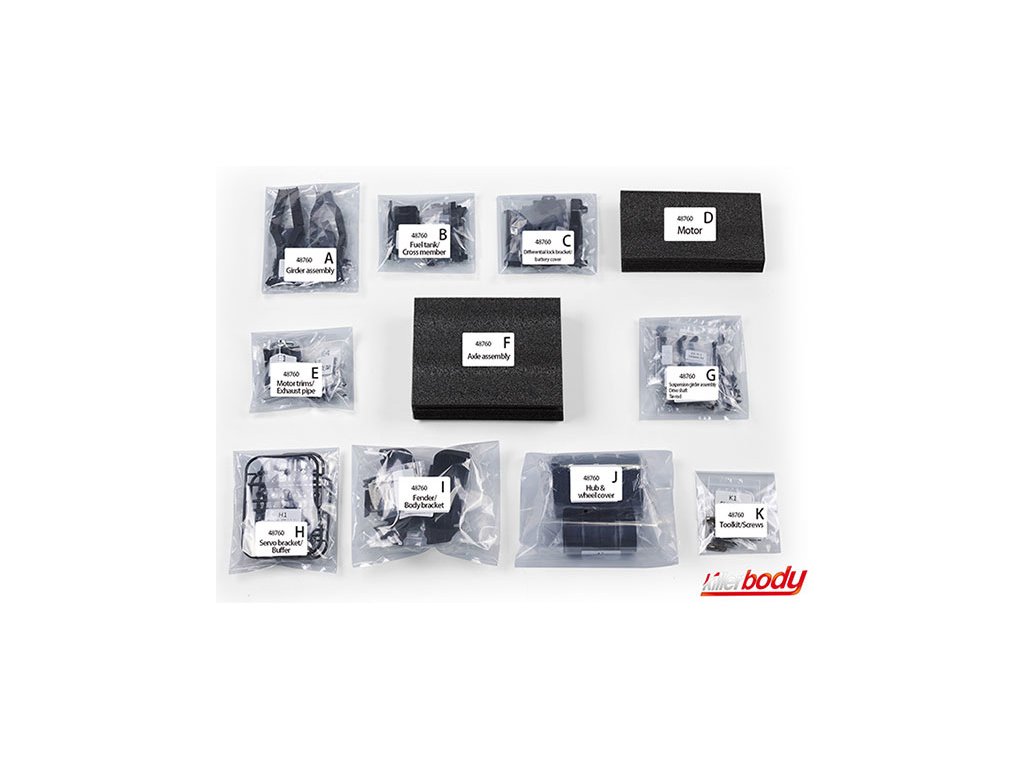 Balení obsahuje jednotlivé díly v sáčcích pro stavbu šasi RC modelu auta Killerbody Mercury 1:10 (pro Jeep): rám podvozku, maketa palivové nádrže, maketa motoru, maketa výfuku, prvky zavěšení, tlumiče, sestavená převodovka a sestavené nápravy, držák serva řízení, blatníky, kola, pneumatiky, montážní příslušenství. Manuál EN a obrázkový manuál pro stavbu EN. Elektronika a karoserie nejsou obsahem balení.