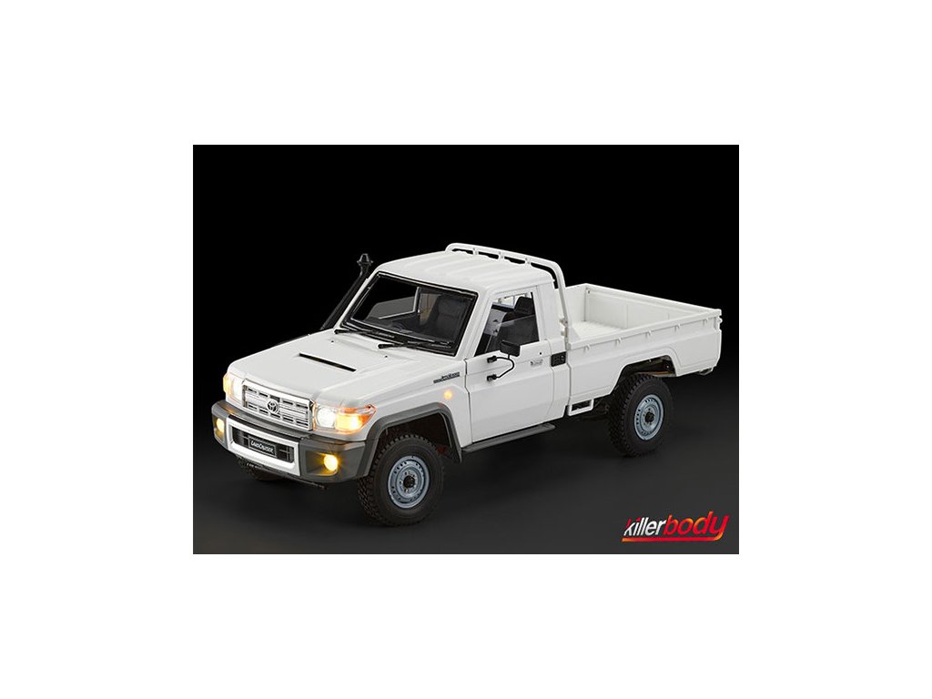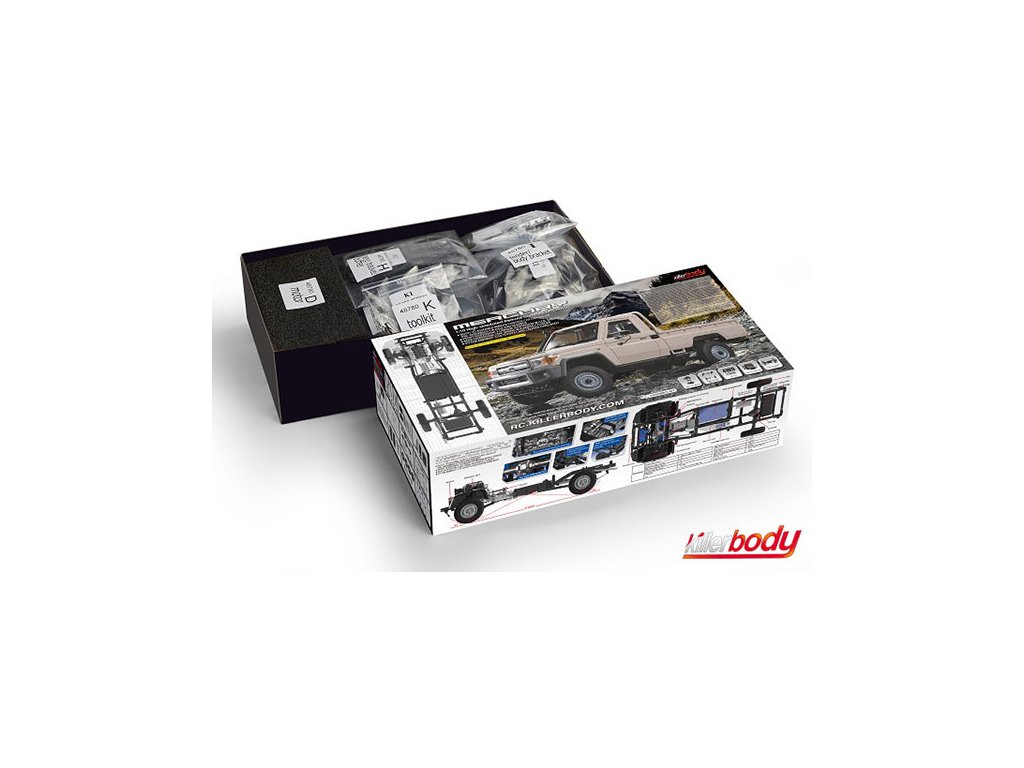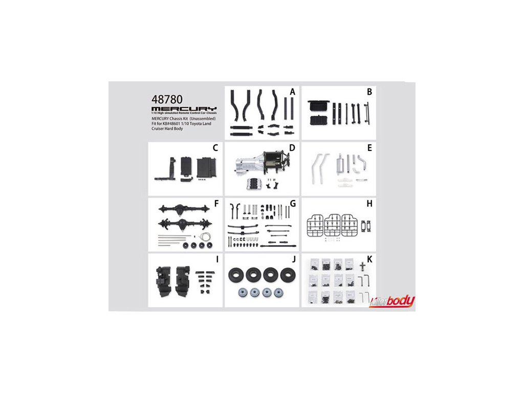 Stavebnice šasi RC modelu auta Killerbody Mercury 1:10, pro karoserii Killerbody LC70. Šasi obsahuje autentické zavěšení přímých náprav, uzávěrky diferenciálů, dvourychlostní převodovku, přepínání 2WD nebo 4WD, maketu motoru a kola. Elektronika a karoserie se prodávají samostatně.