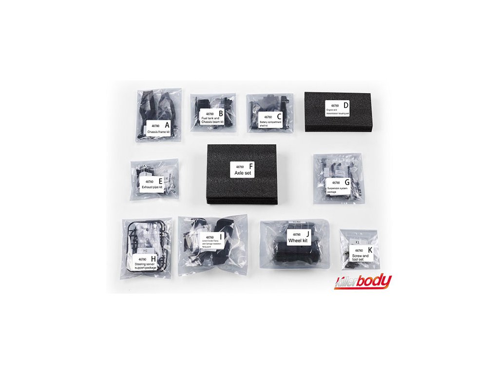 Balení obsahuje jednotlivé díly v sáčcích pro stavbu šasi RC modelu auta Killerbody Mercury 1:10 (pro LC70): rám podvozku, maketa palivové nádrže, maketa motoru, maketa výfuku, prvky zavěšení, tlumiče (listová pera, vzadu), sestavená převodovka a sestavené nápravy, držák serva řízení, blatníky, kola, pneumatiky, montážní příslušenství. Obrázkový manuál pro stavbu EN. Elektronika a karoserie nejsou obsahem balení.
