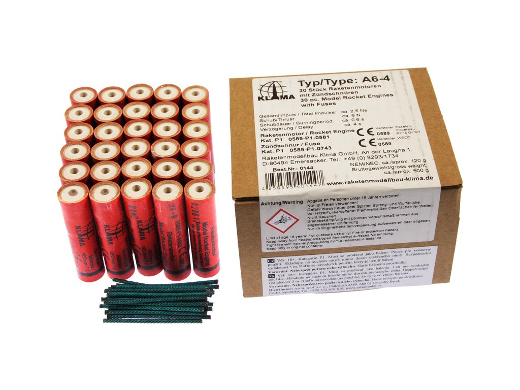 Obsahem balení je 30 raketových motorků Klima A6-4 včetně zápalnic, návod k použití.